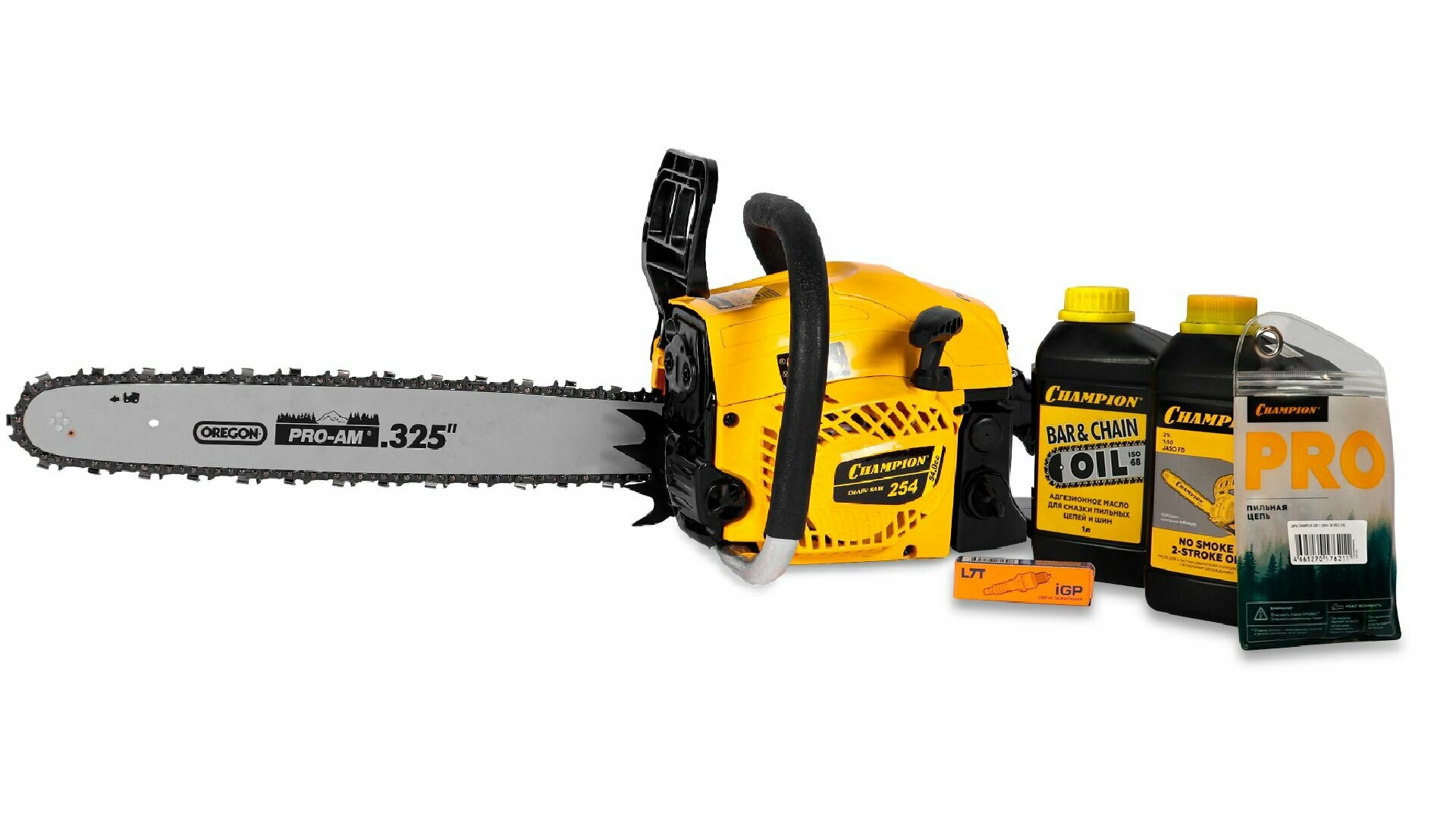 Бензопила цепная бензиновая Champion 254-18 (2.5 кВт, 54 см3, легкий старт, 5.1 кг) + масло для цепи и для топливной смеси, свеча, смазка и цепь