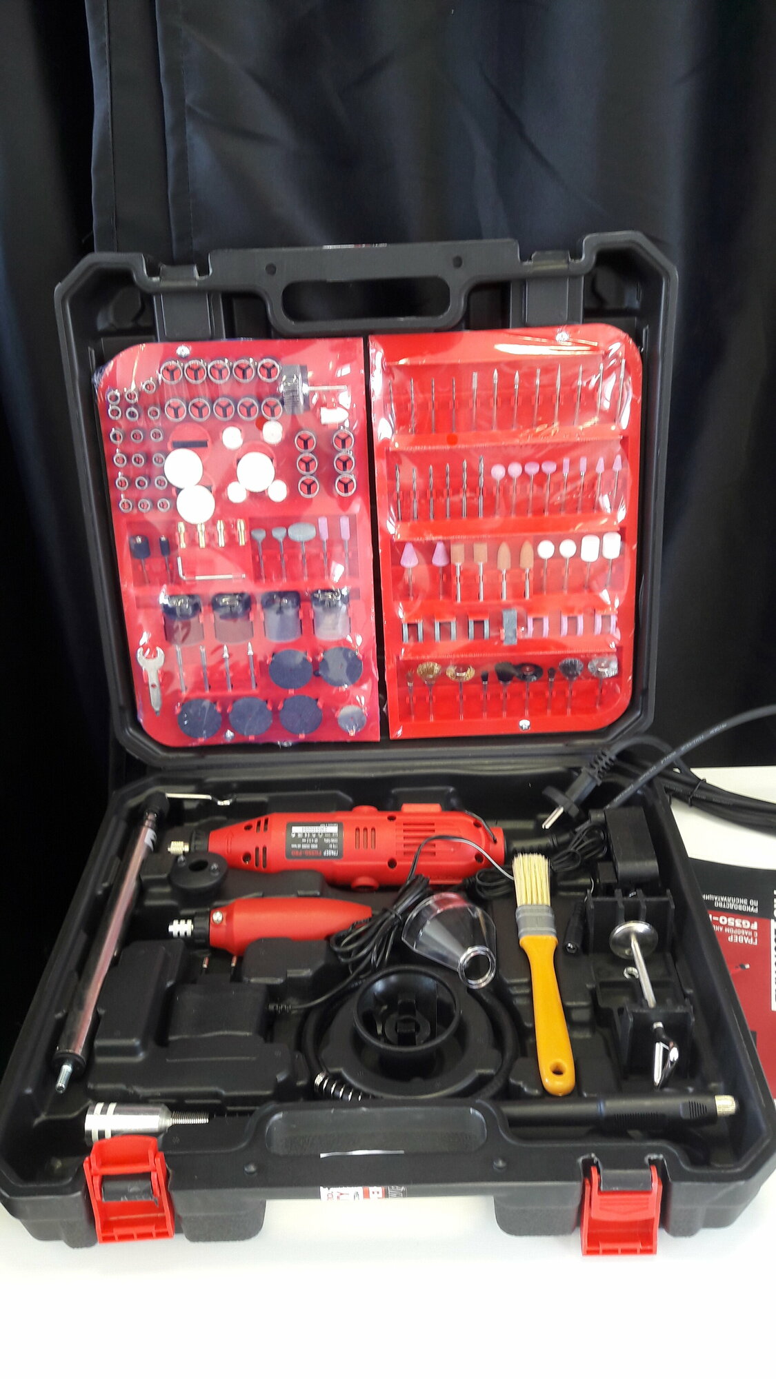 | Комплектация | -кейс; -дополнительная бормашина 12 В; -набор аксессуаров 236 шт. |