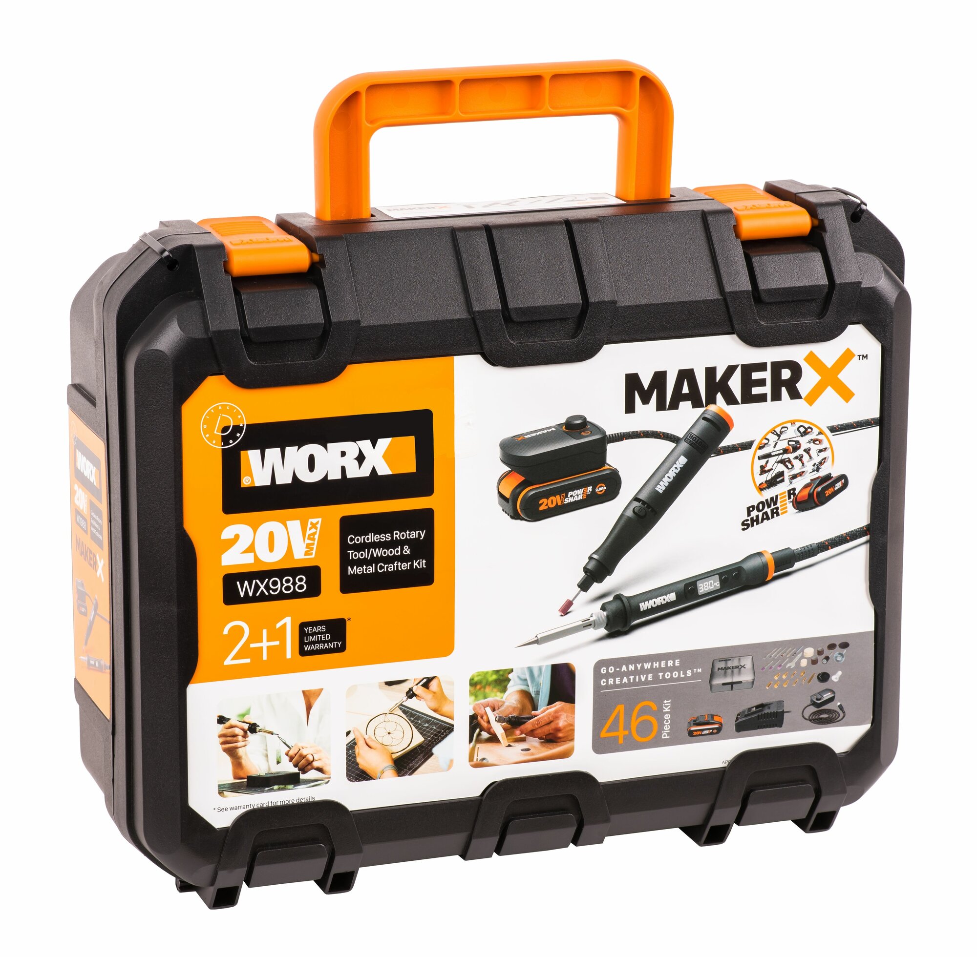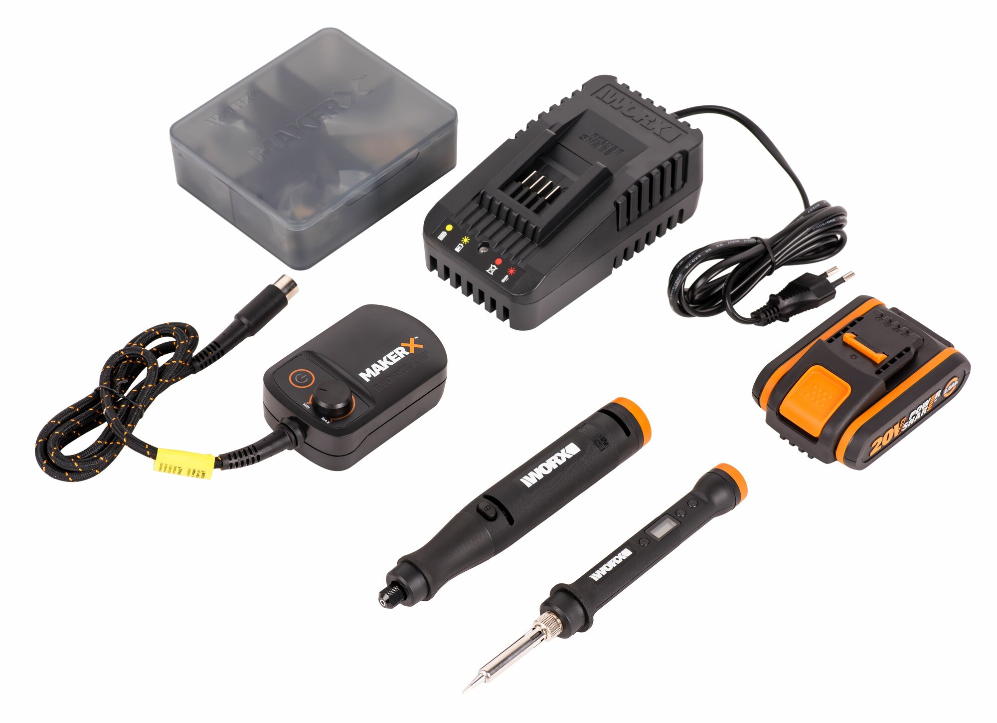 Набор WORX MAKER X WX988 20V аккумуляторный: гравировальная машинка WORX WX739 + выжигатель-паяльник аккумуляторный WORX WX744 с 2Ач батареей и зарядкой