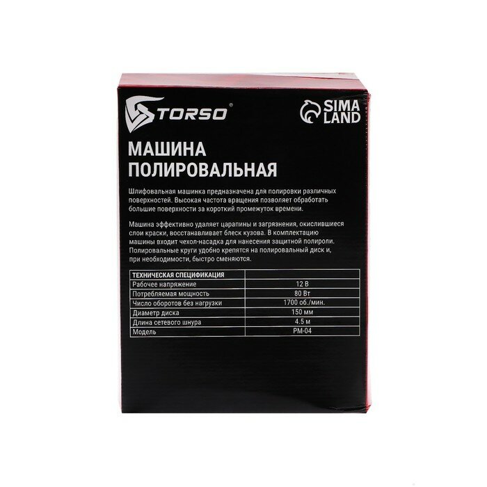 Купить Машина полировальная Torso, 12 В, 80 Вт, 1700 об/мин, 150 мм, провод 4.5 м