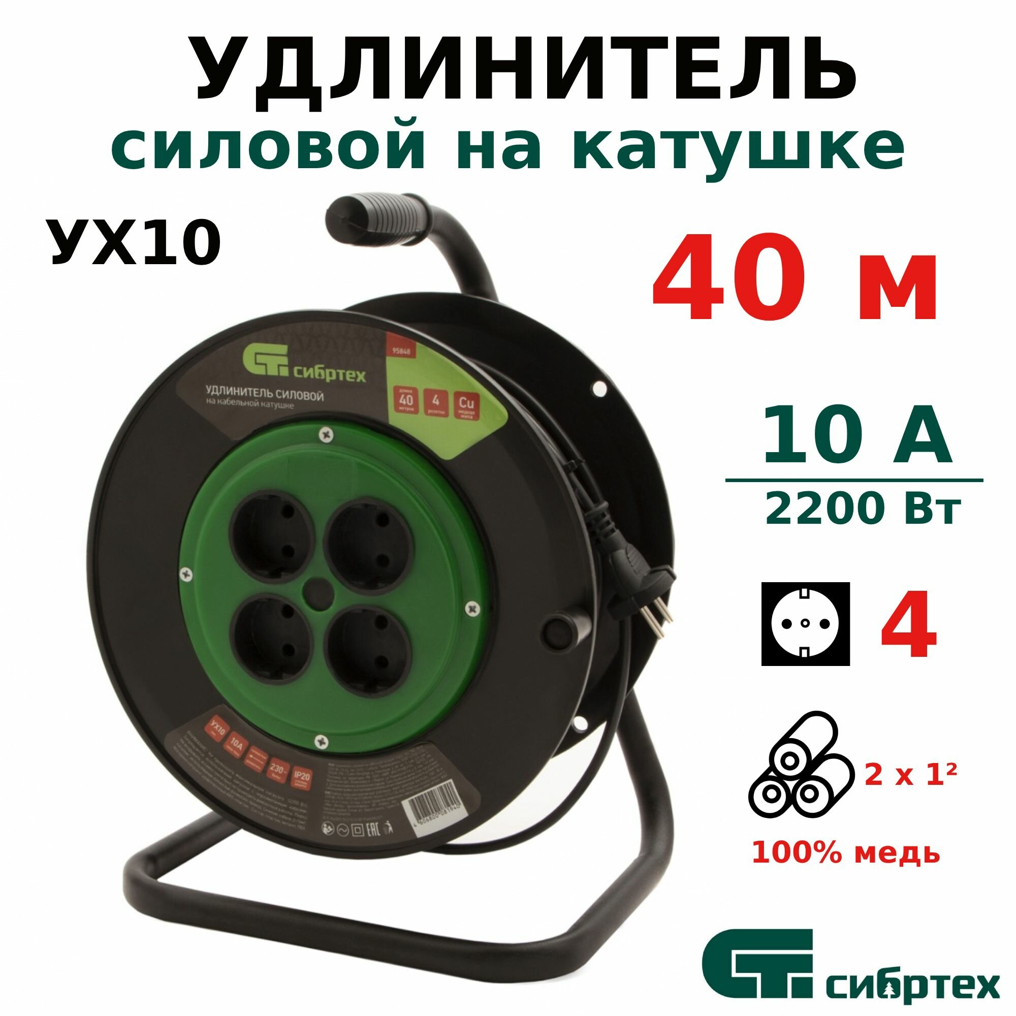 Удлинитель силовой на кабельной катушке, 4 роз б/з, ПВС, 40м, 2200 Вт (10А), тип УХ10// Сибртех арт. 95848