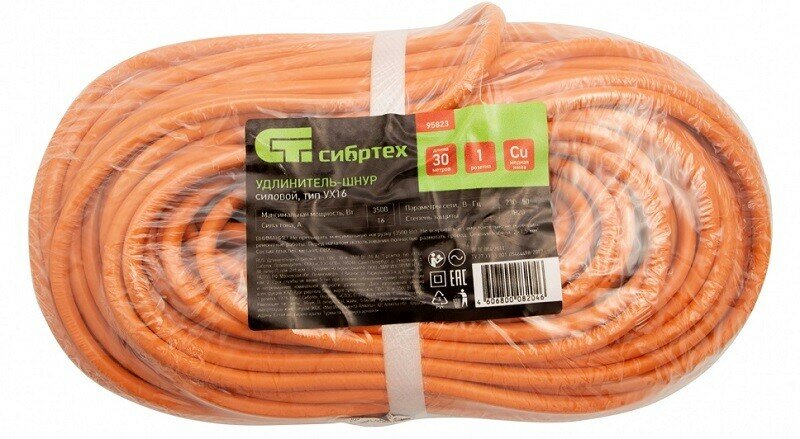 Удлинитель-шнур силовой 30 м, 16А, тип УХ16, ПВС, 1 розетка без заземления Сибртех интересное: