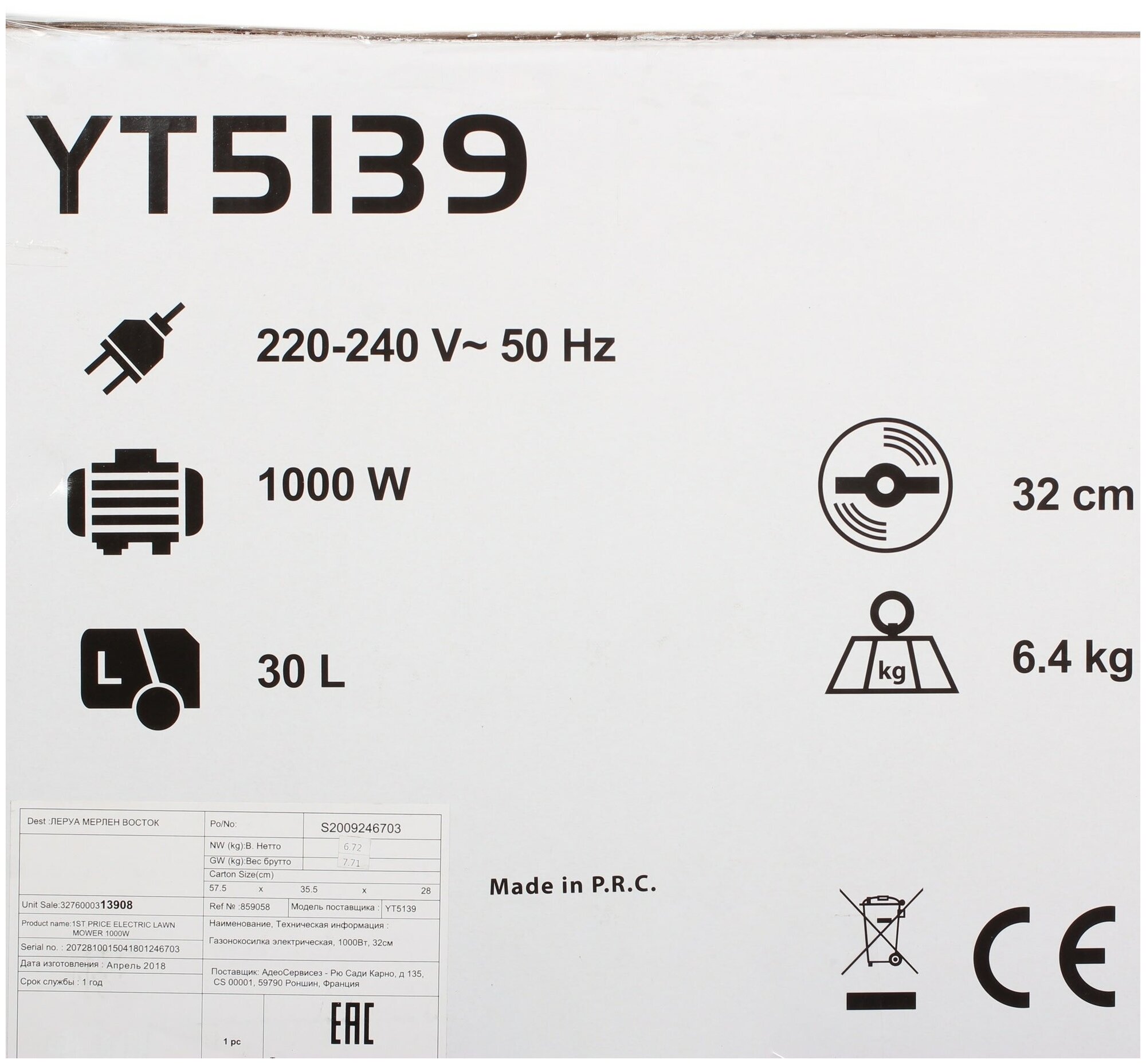 Купить Газонокосилка электрическая YT5139 1000 Вт 32 см