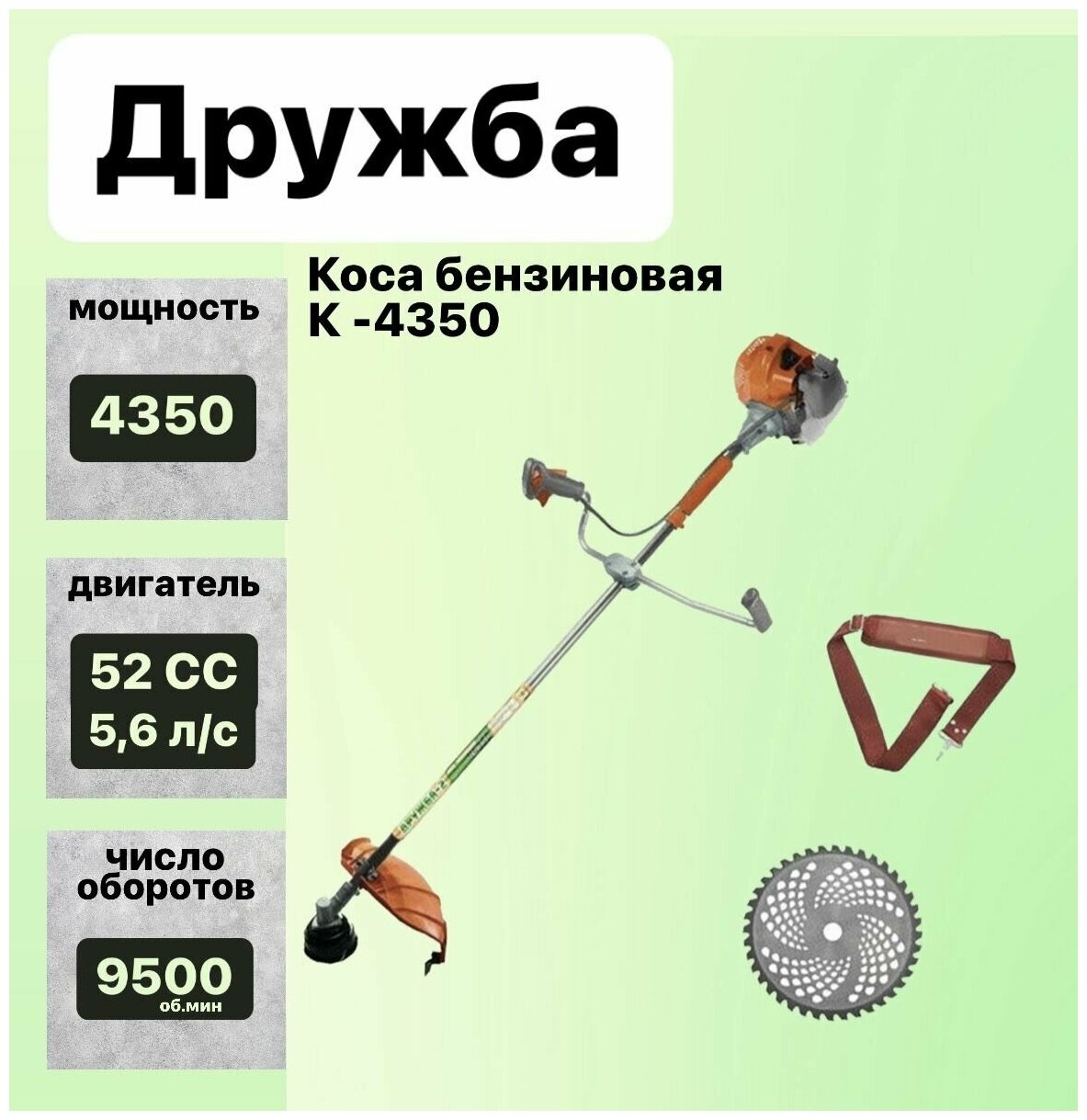 Коса бензиновая, Триммер дружба К4350/52сс (2х тактный двигатель), 52 СС, 4350Вт, 9500об/мин, 415мм