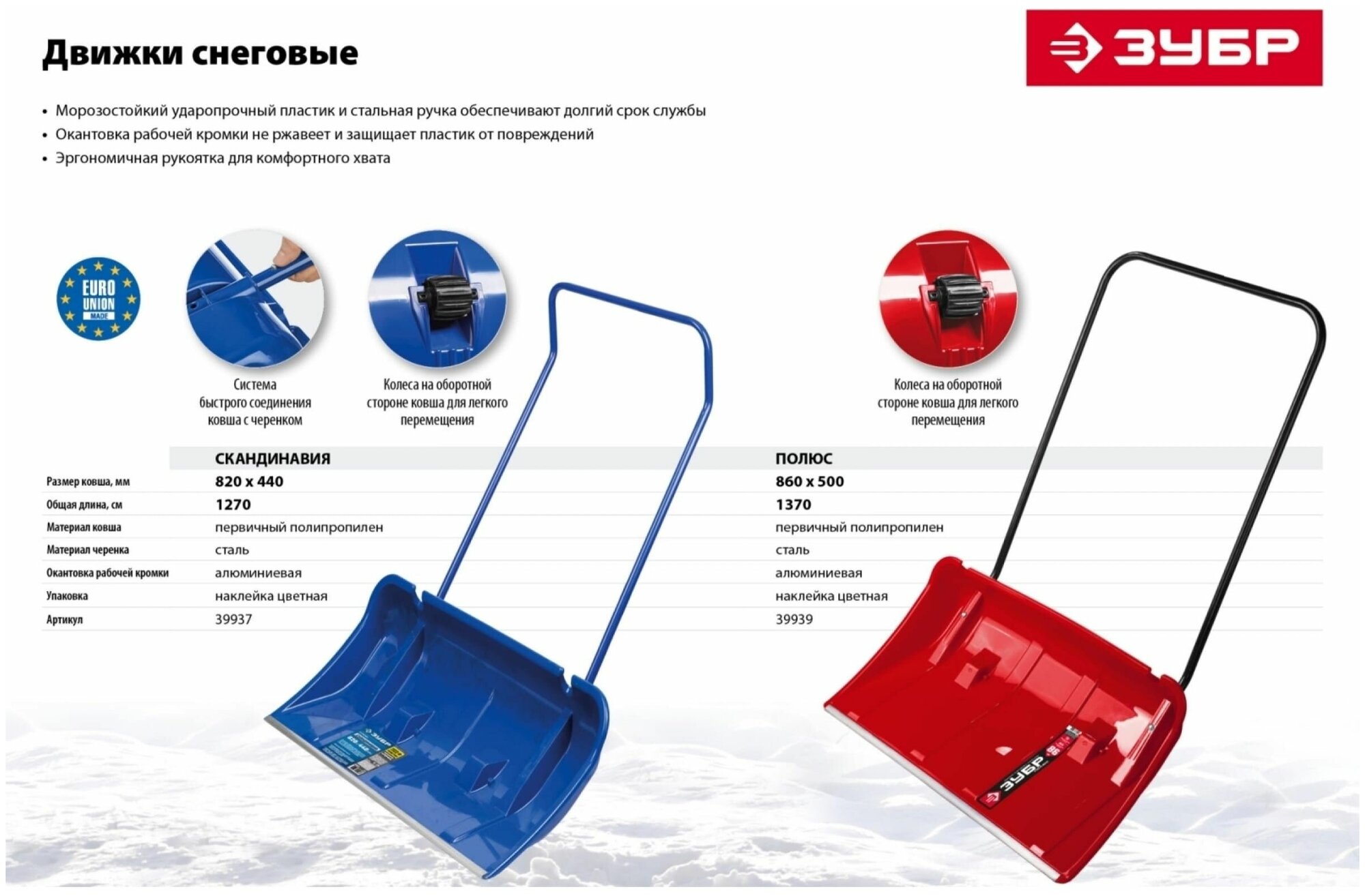 Снеговой движок (скрепер) ЗУБР скандинавия 800 мм пластиковый ковш с алюминиевой планкой с колесиками 39937_z01