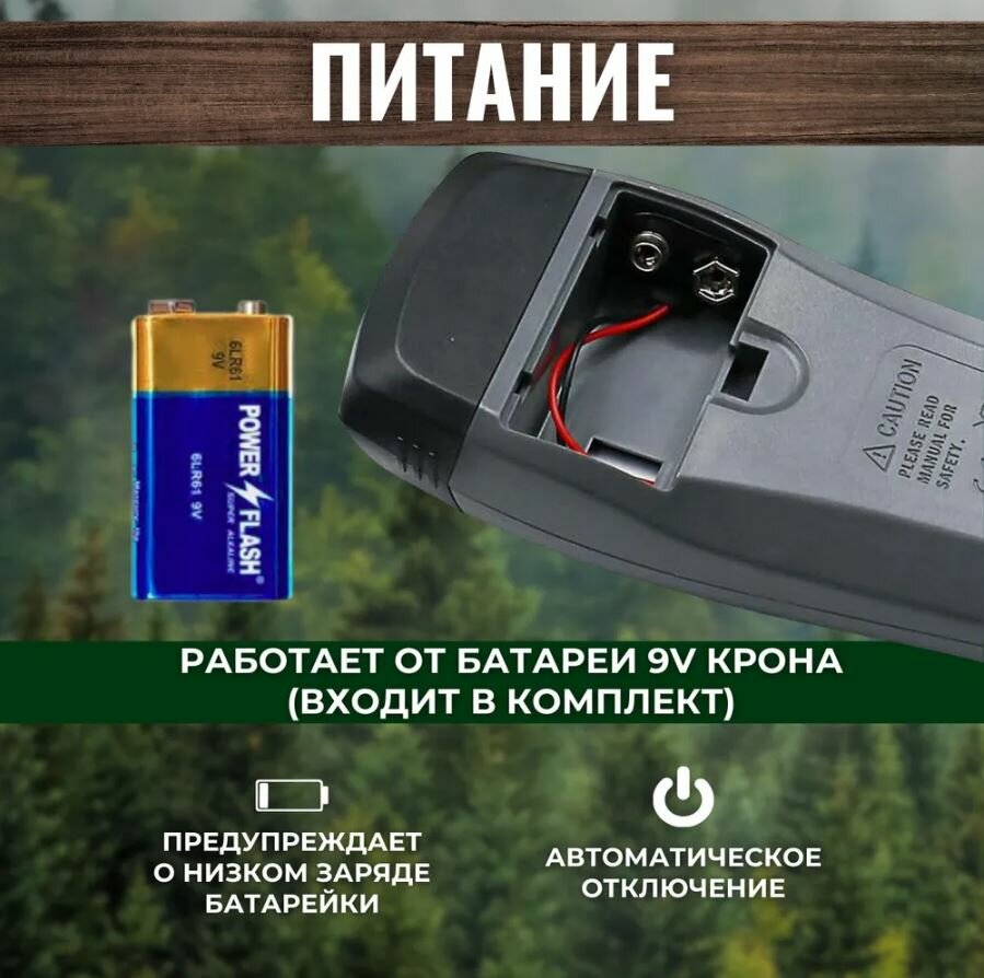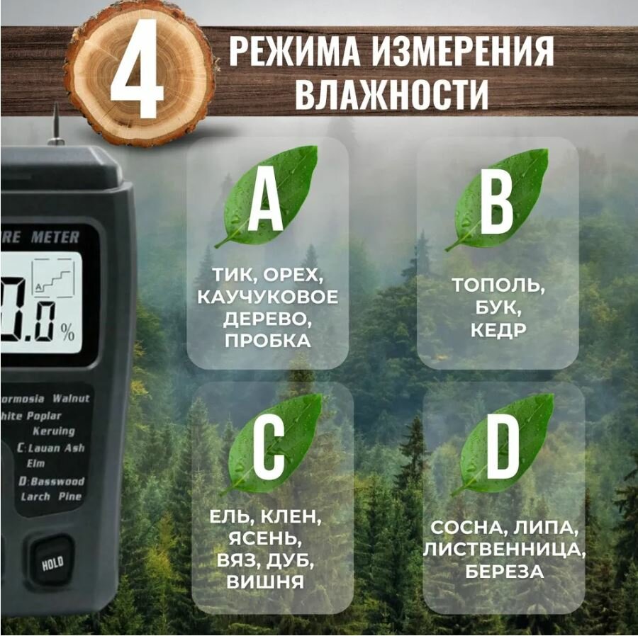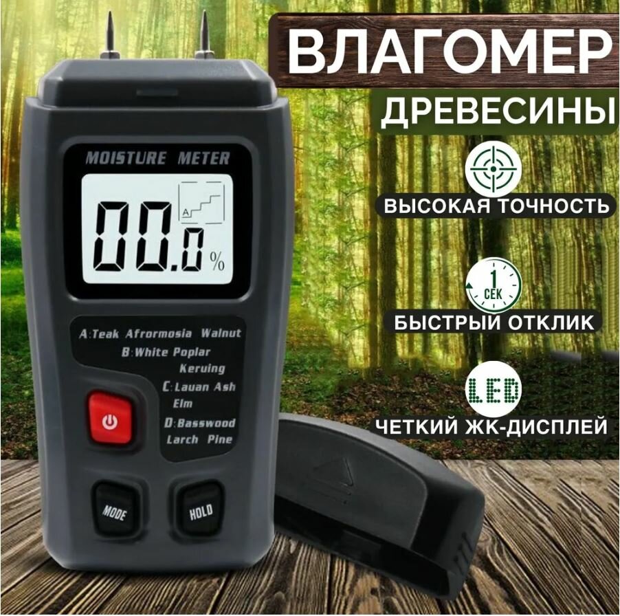| Минусы: | влажность дерева меньше 10% не показывает. |