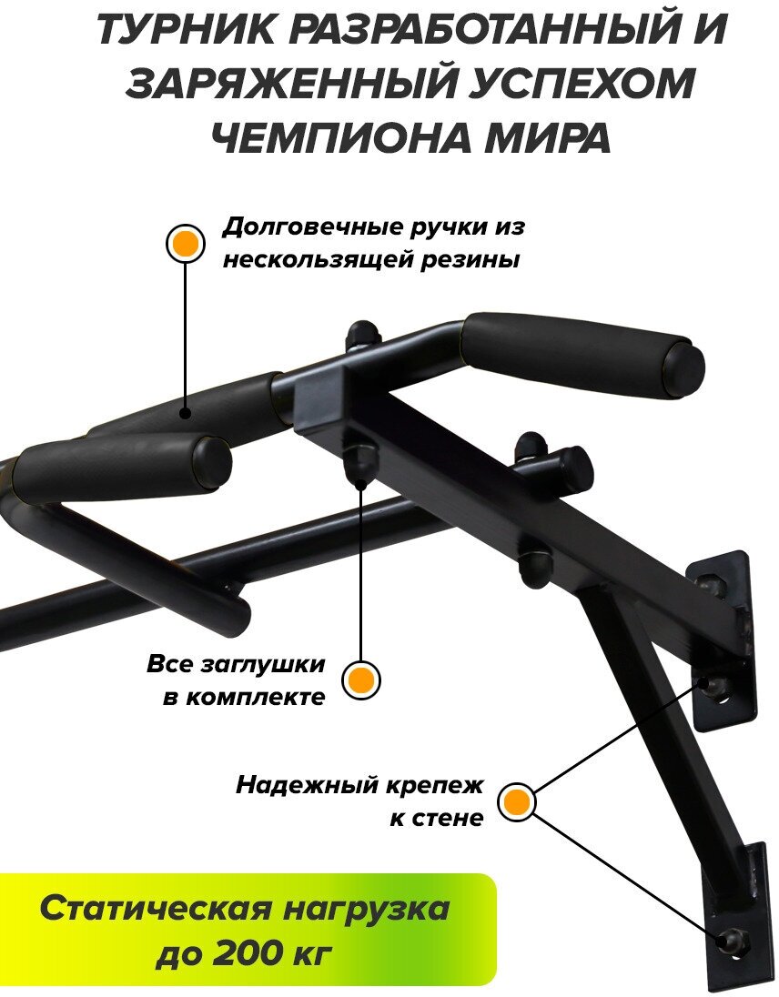 Турник настенный 3 в 1 брусья пресс тренажер для спорта дома, усиленный, нагрузка 300кг Триумф черный (с неопреновыми ручками)