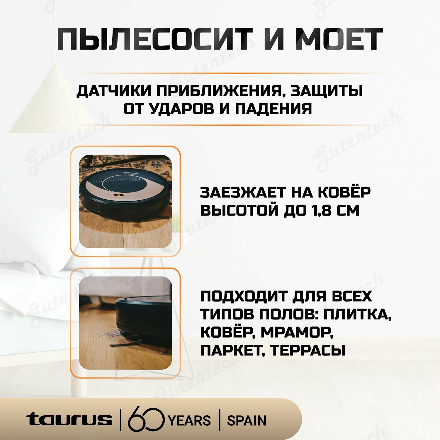 Робот-пылесос Taurus Homeland / 6 режимов уборки / пылесосит и моет / пульт дистанционного управления / черно-золотой