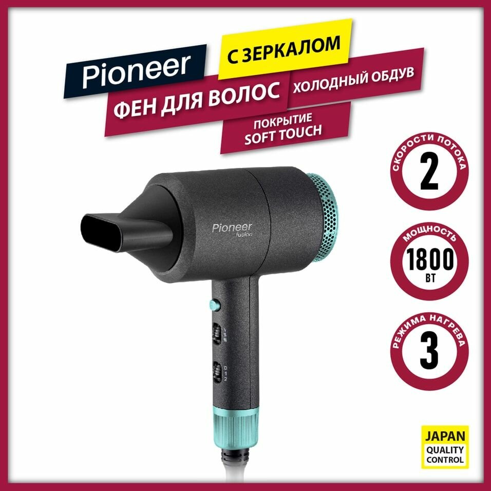 Фен Pioneer HD-1802 с концентратором и встроенным зеркалом, 2 скорости воздушного потока, 3 режима нагрева, функция холодного обдува, 1800 Вт