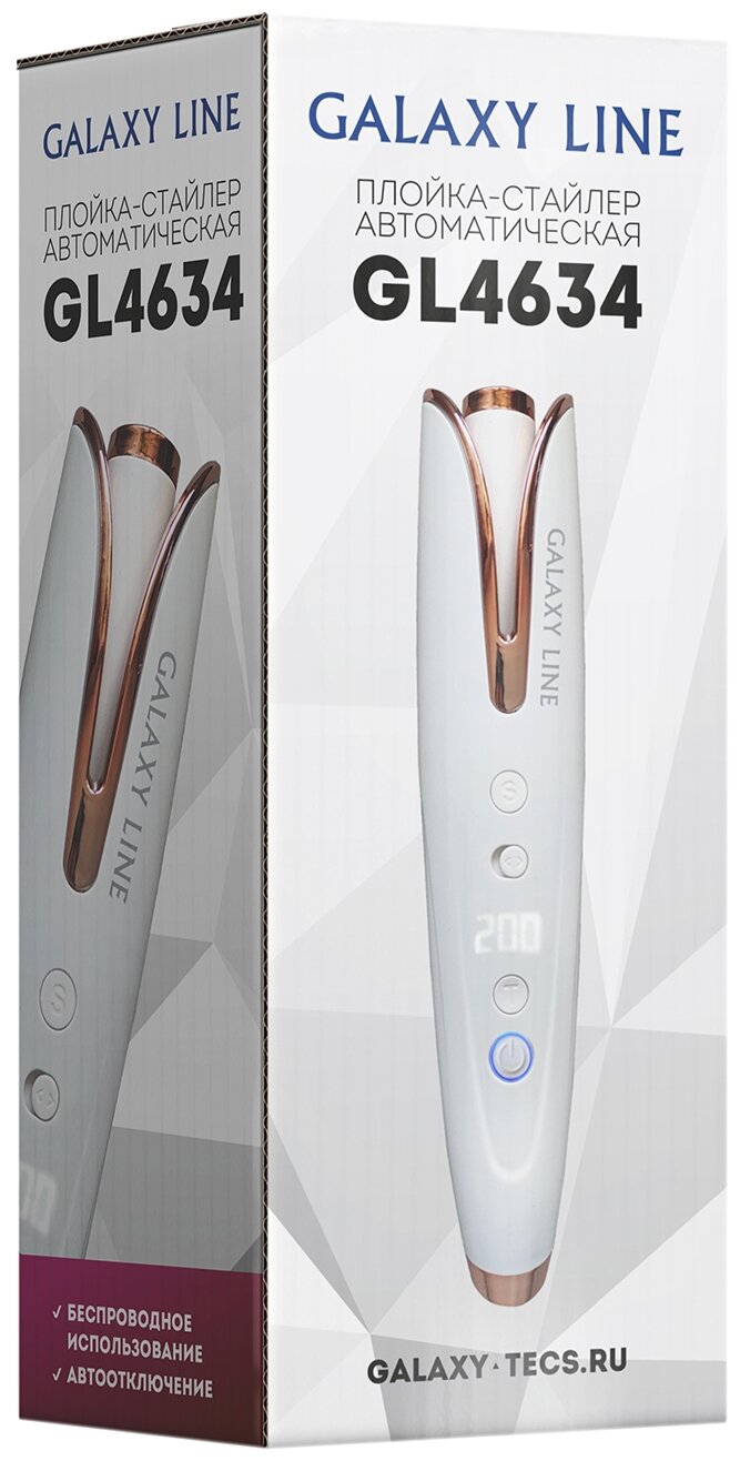 GALAXY LINE GL 4634 Плойка- стайлер автоматическая 50 Вт, аккумулятор Li-Ion 4800мА*ч, напряжение 3,7В, время непрерывной работы до 60 мин (при 140С), камера для укладки с керамическим покрытием диаметром 22 мм, нагревательный элемент с защитой от перегре