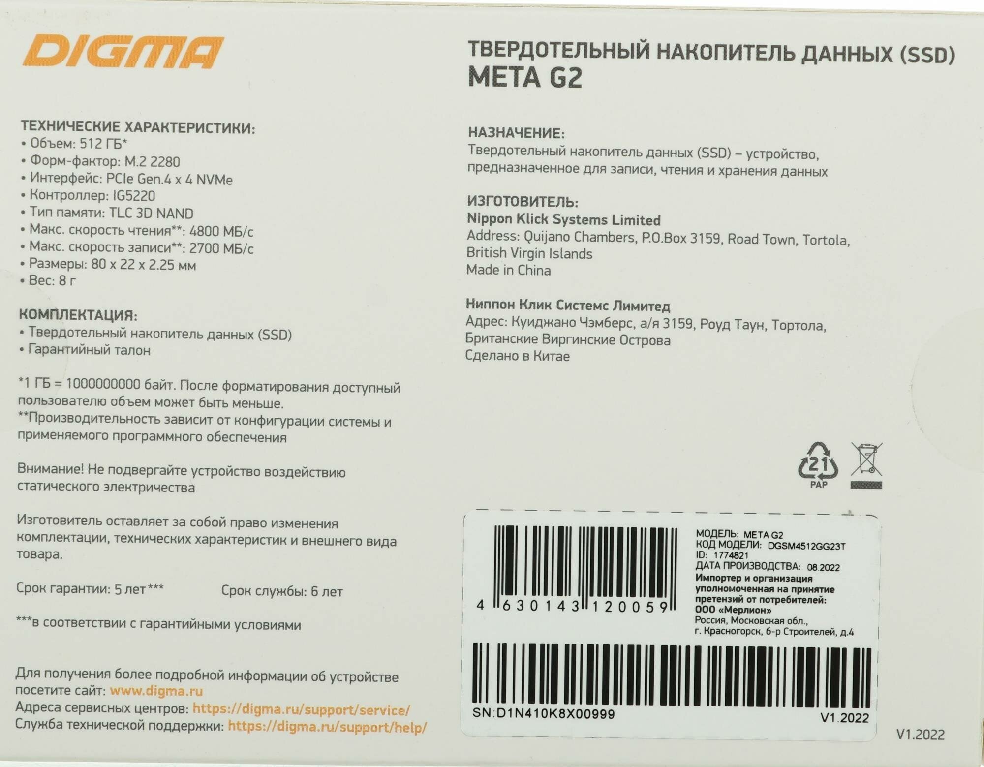 SSD накопитель Digma Meta G2 DGSM4512GG23T 512ГБ, M.2 2280, PCI-E 4.0 x4, NVMe, M.2, rtl