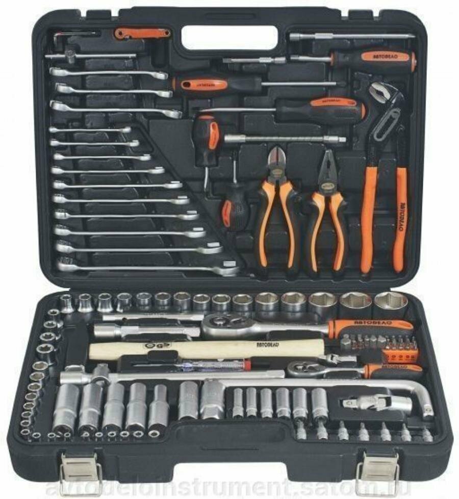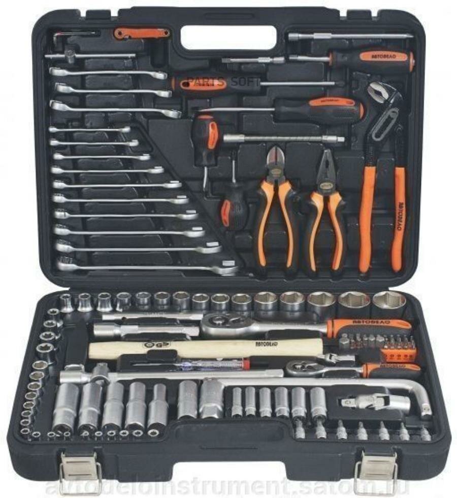 | Инструменты в комплекте | вороток для головок / ключ переставной гаечный / ключи гаечные / ключи имбусовые (шестигранные) / кусачки / молоток / отвёртки / пассатижи / рукоять для бит / трещотка |