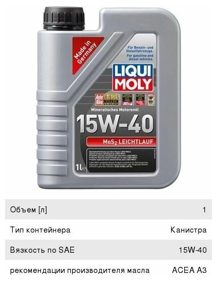 Минеральное моторное масло LIQUI MOLY Моторные масла MoS2 Leichtlauf 15W-40 1л