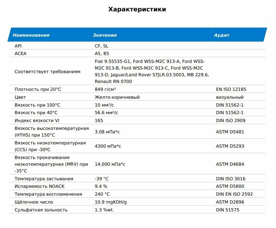 | Допуски OEM | FIAT 9.55535-G1 / Ford WSS-M2C 913-A / Ford WSS-M2C 913-B / Ford WSS-M2C 913-C / Ford WSS-M2C 913-D / Jaguar/Land Rover STJLR.03.5003 / MB 229.6 / Mazda / Renault RN 0700 |