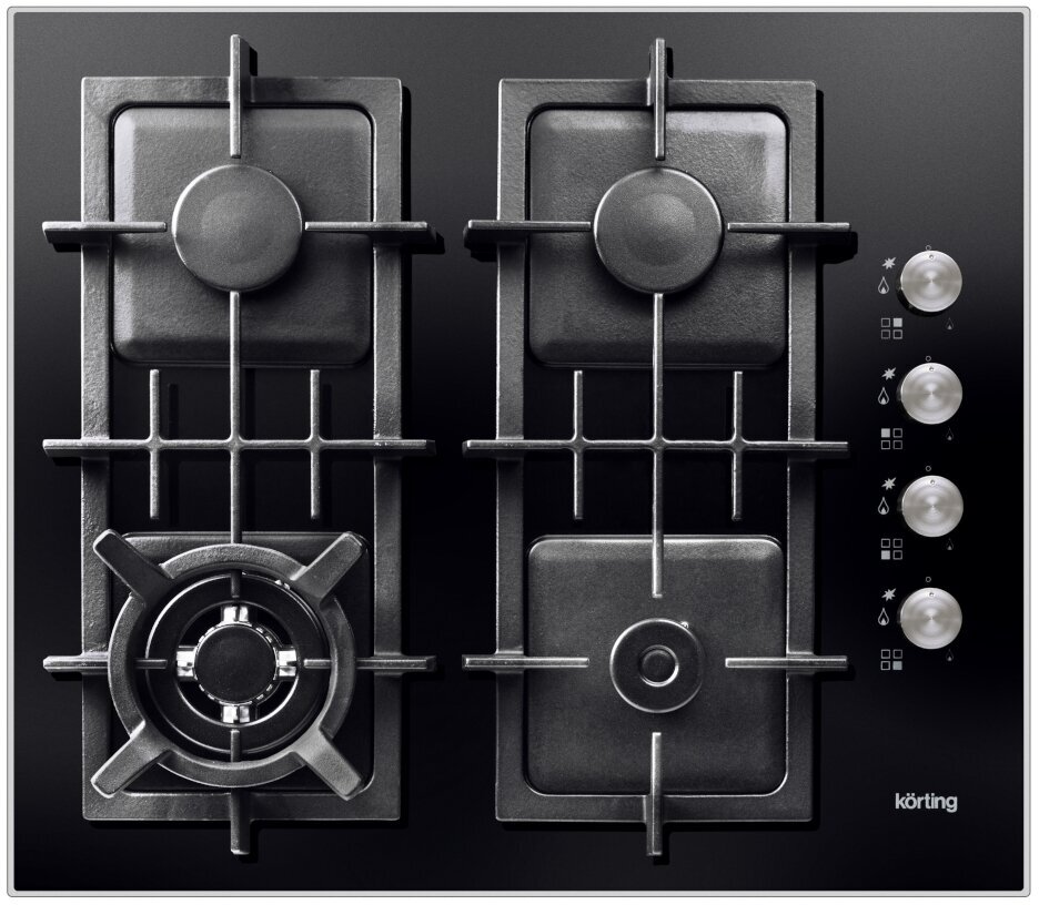 Встраиваемые газовые панели Korting/ Газ, Crystal, 60x51 см, газовая, независимая, электроподжиг, газ-контроль, чугунные решетки, в комплекте - подставка WOK и адаптер для кофейника, цвет-матовый черный