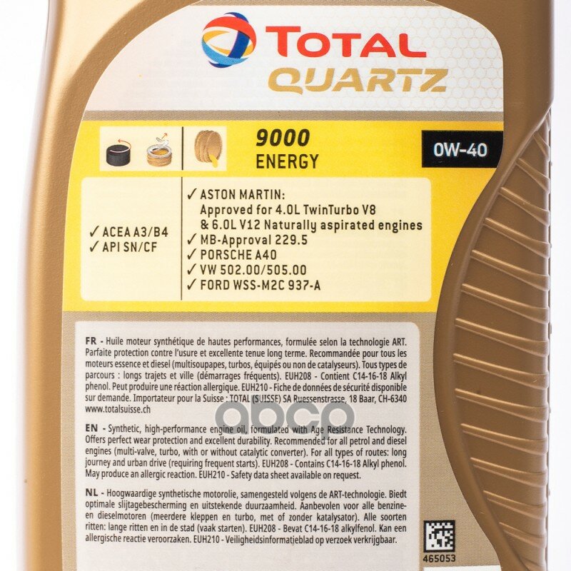 TOTALENERGIES 213989 Масло моторное синтетическое 5 л. TOTAL QUARTZ 9000 ENERGY 0W-40, ACEA A3, B4, API SN, CF, VW 505 00, VW 502 00, Porsche A40, MB 229.5, WSS-M2C937-A 1шт