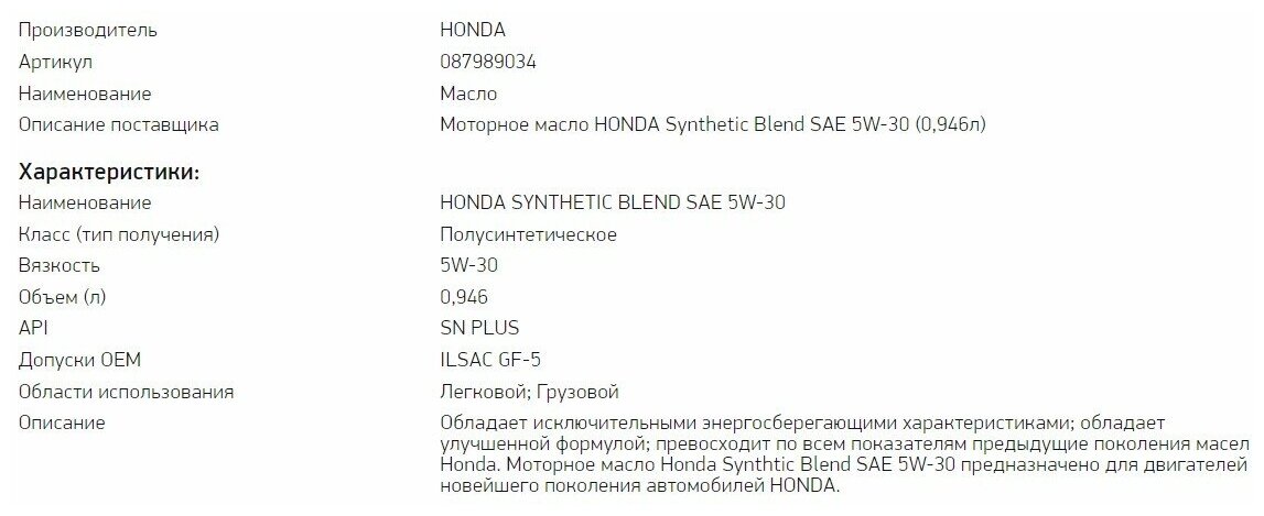Масло моторное synthetic blend sae 5w30 (0 946л) (старый артикул 08798-9034) Honda 087989134