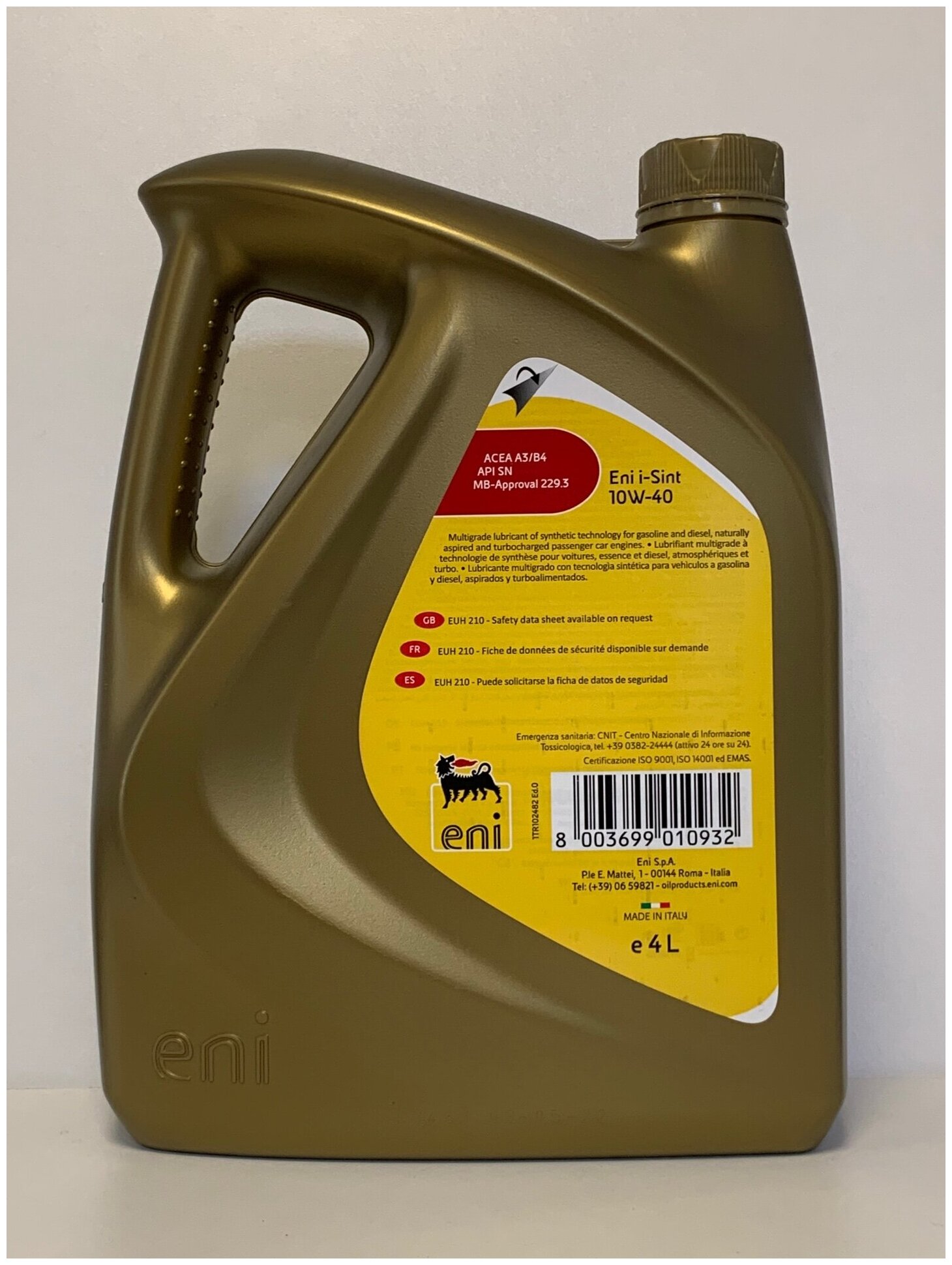 ENI ENI 10W40 I-SINT/4 Масло моторное полусинтетическое 4л - для легковых автомобилей API: SN, ACEA: A3/B4, MB: 229.3 (уп.-4шт) 1шт