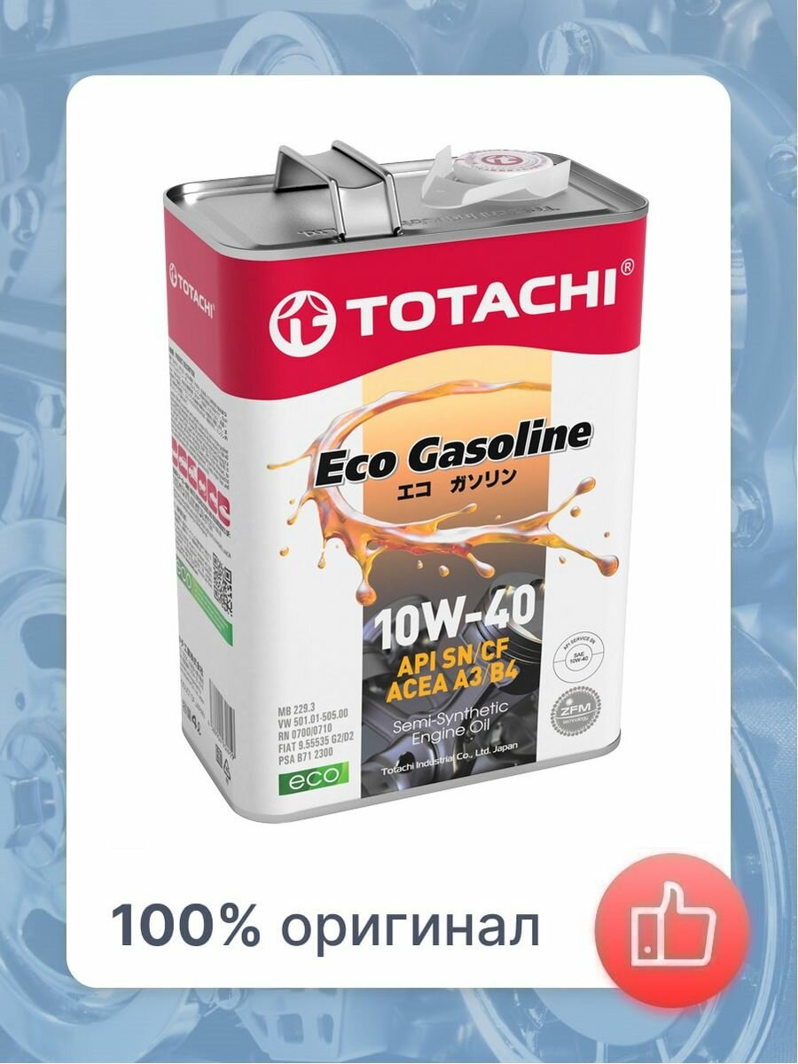 Масло моторное Totachi Eco Gasoline 10w40 полусинтетическое, API SN/CF, ACEA A3/B3/B4, универсальное, 4л, арт. 4589904934919/10904