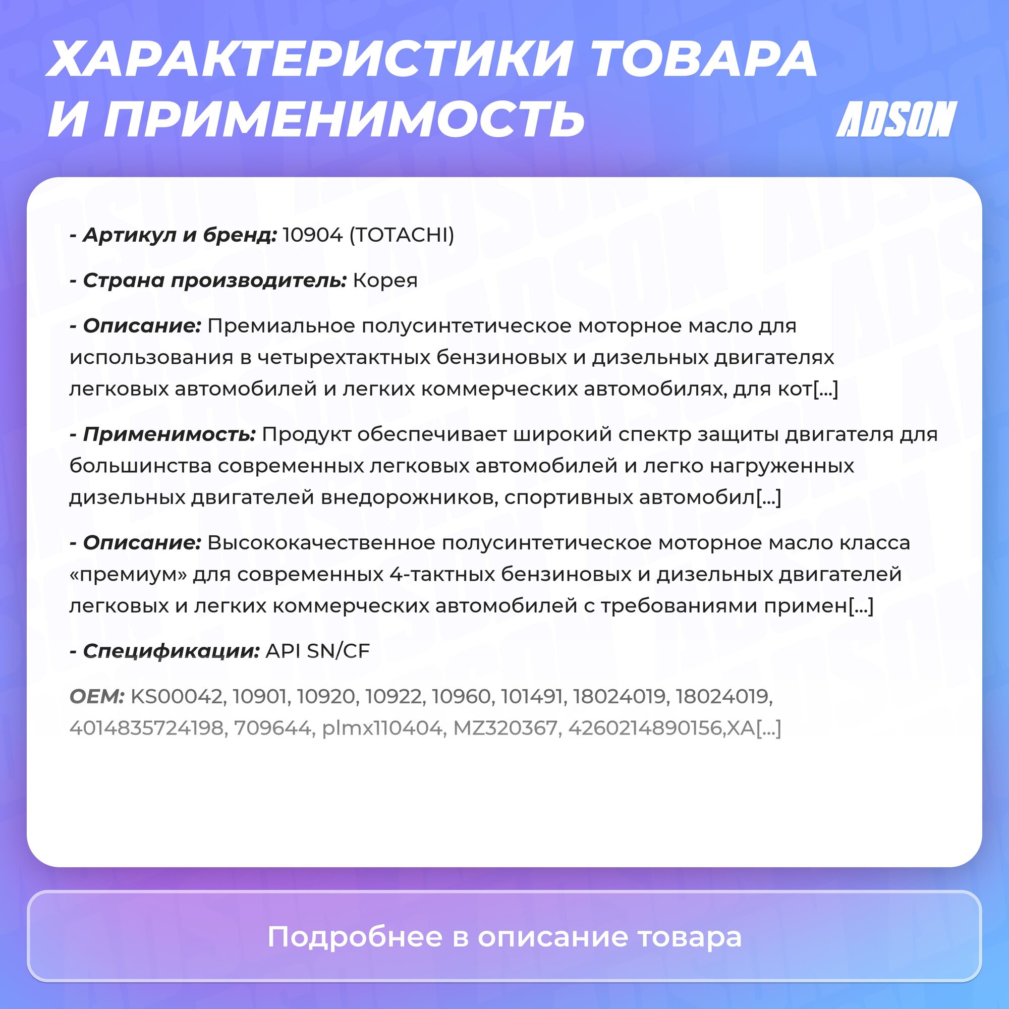 СохранитьПолусинтетическое моторное масло TOTACHI Eco Gasoline SN/CF 10W-40, 4л 10904 интересное: