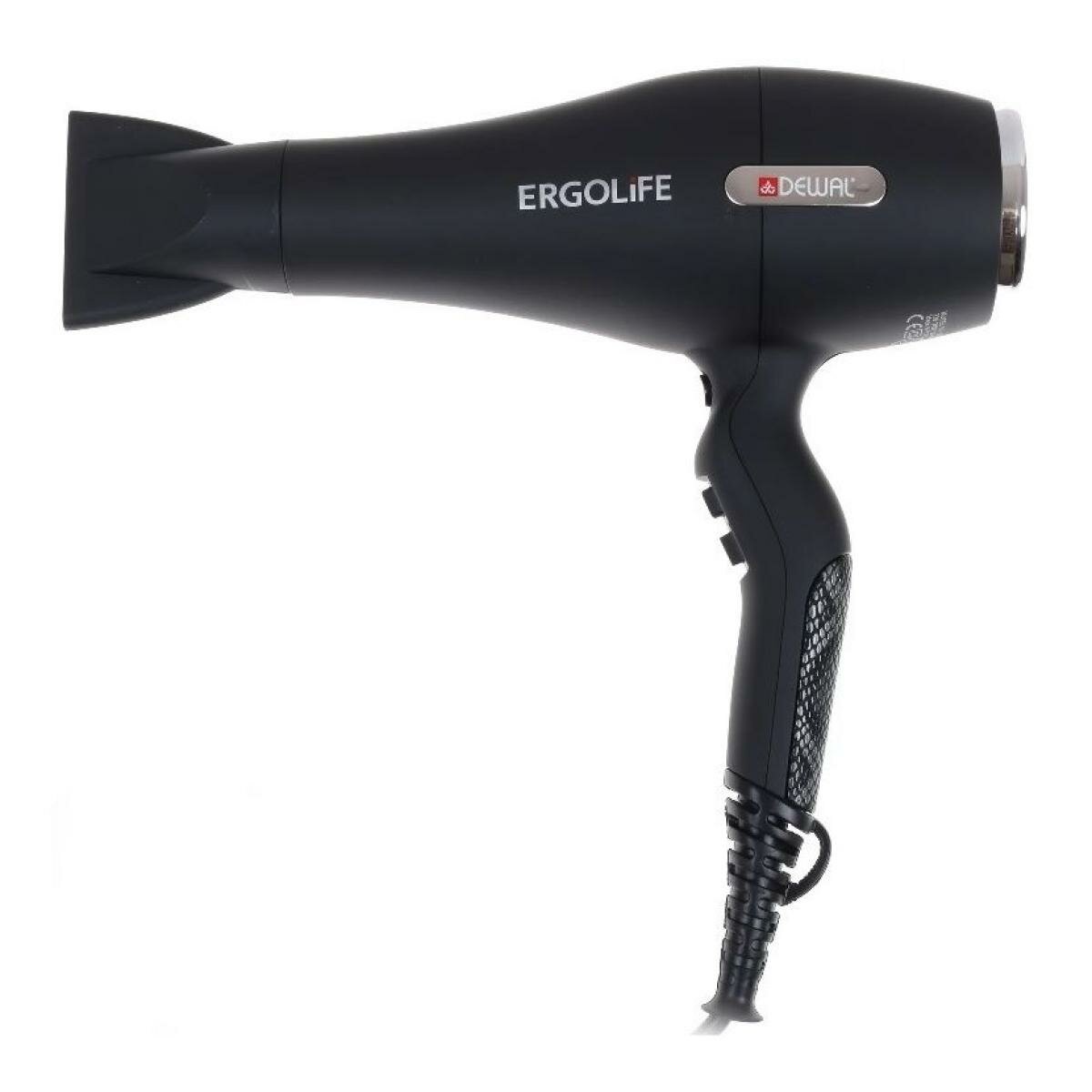 Фен DEWAL ERGOLIFE, черный софттач, вес 590гр, 2200Вт, ионизация, 2 нас, провод 3м