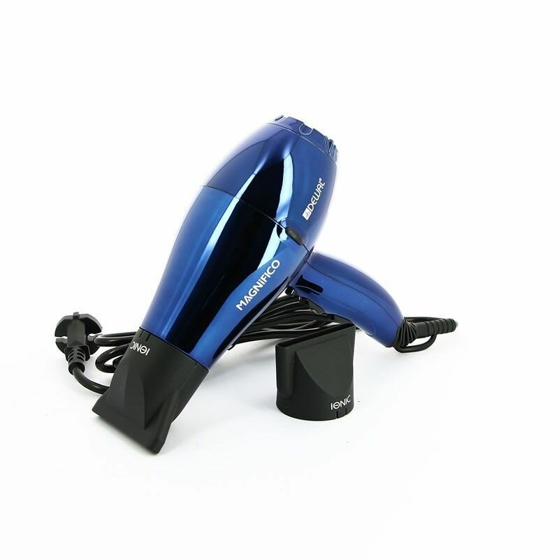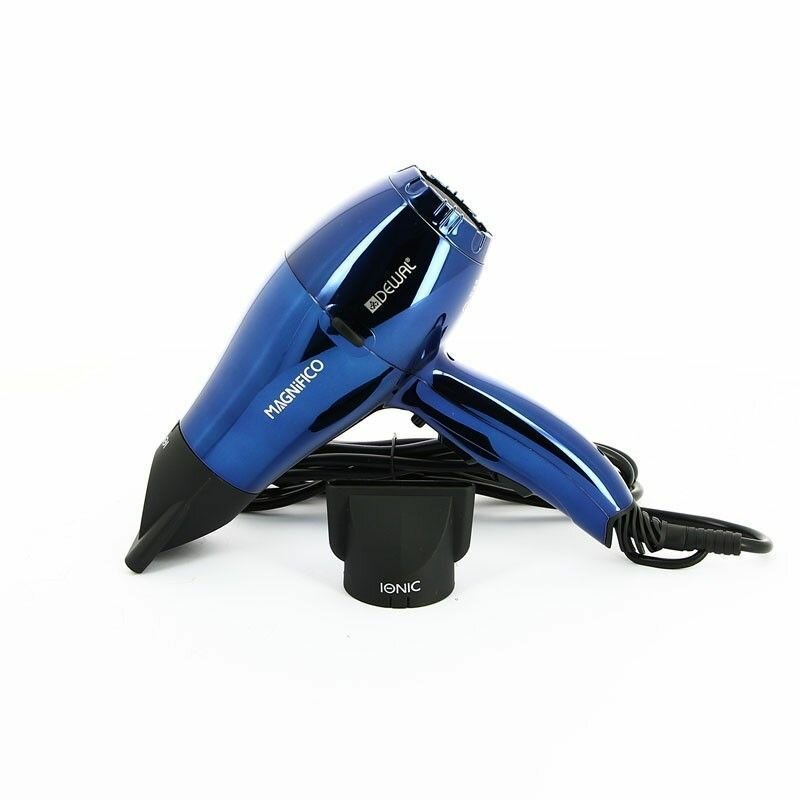 Фен DEWAL MAGNIFICO, зерк.синий, вес 550гр, размер 17см, 2000Вт, ионизация, 2 нас, провод 3м