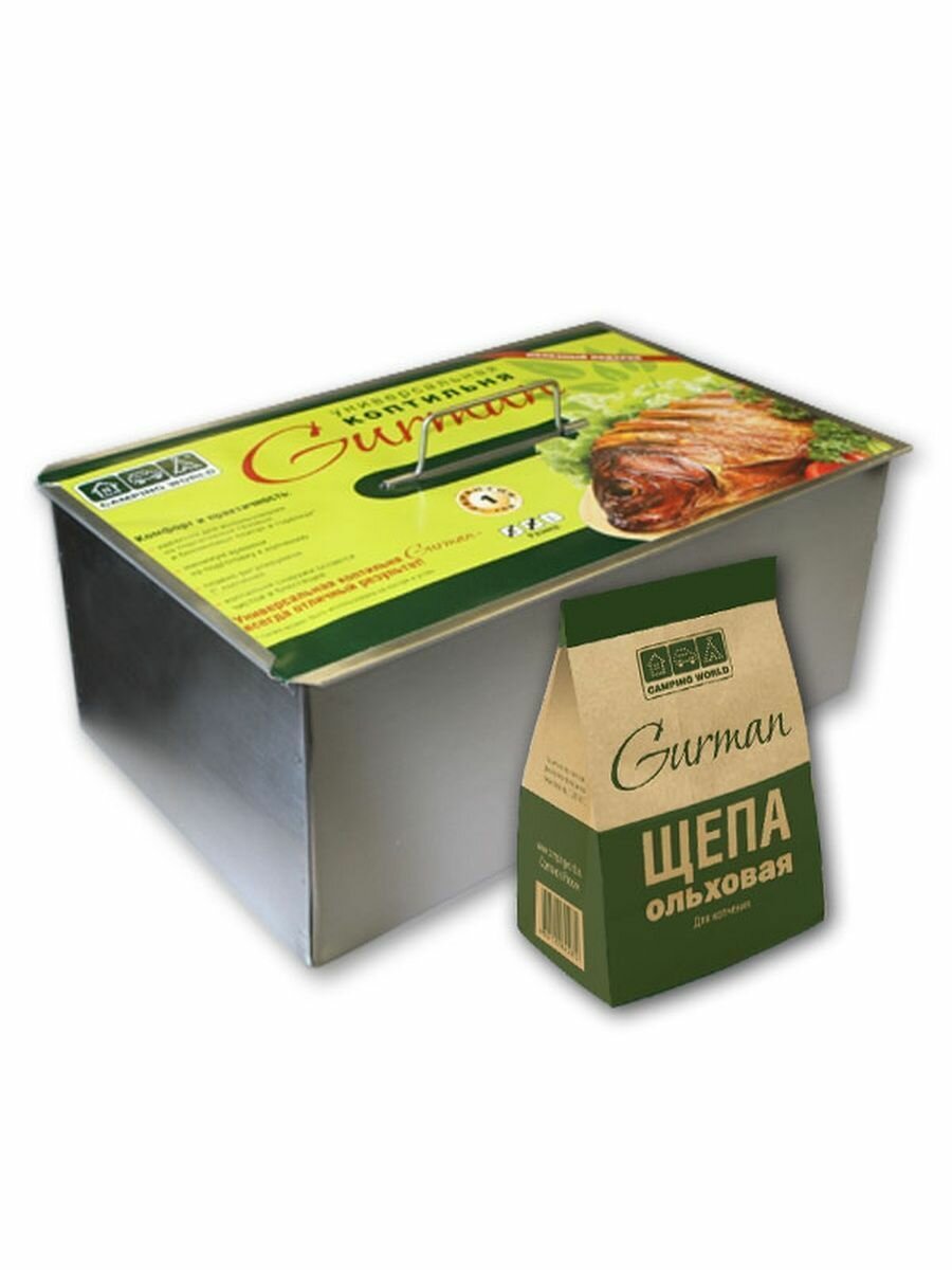 Универсальная коптильня Camping World Gurman, размер M( 375 х 275 х165), 2 яруса, вес 3,5 кг, щепа 0,8л в комплекте, подарочная упаковка