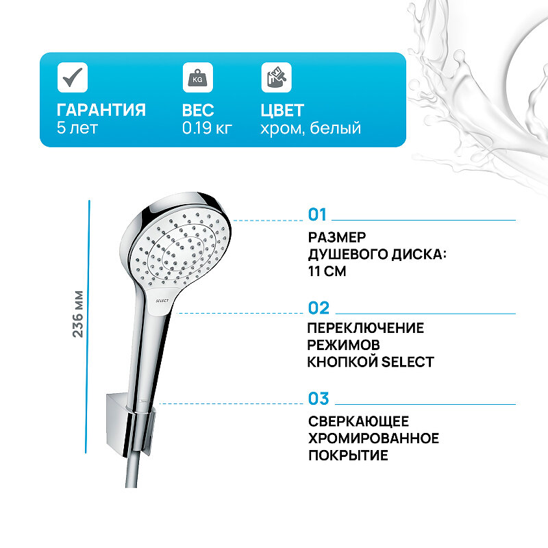 Душевая лейка Hansgrohe Croma Select S, арт. 26411400, 3 режима, белый цвет, шланг в комплекте, антикальк