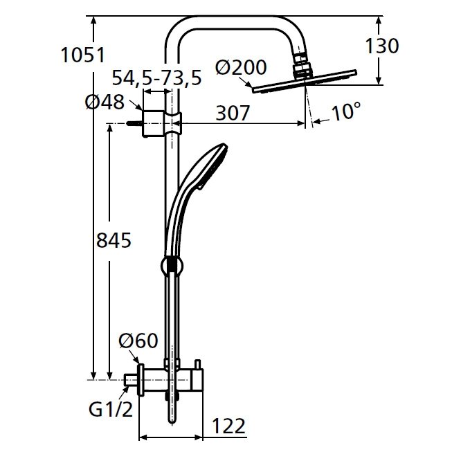 | Дополнительная информация | высота стойки для душа: 1051 мм; диаметр душевой лейки: 100 мм; диаметр верхнего душа: 200 мм |