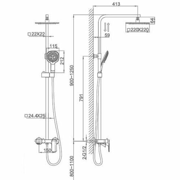 | Дополнительная информация | высота стойки для душа: 1250 мм; диаметр душевой лейки: 115 мм; длина верхнего душа: 220 мм; ширина верхнего душа: 220 мм |
