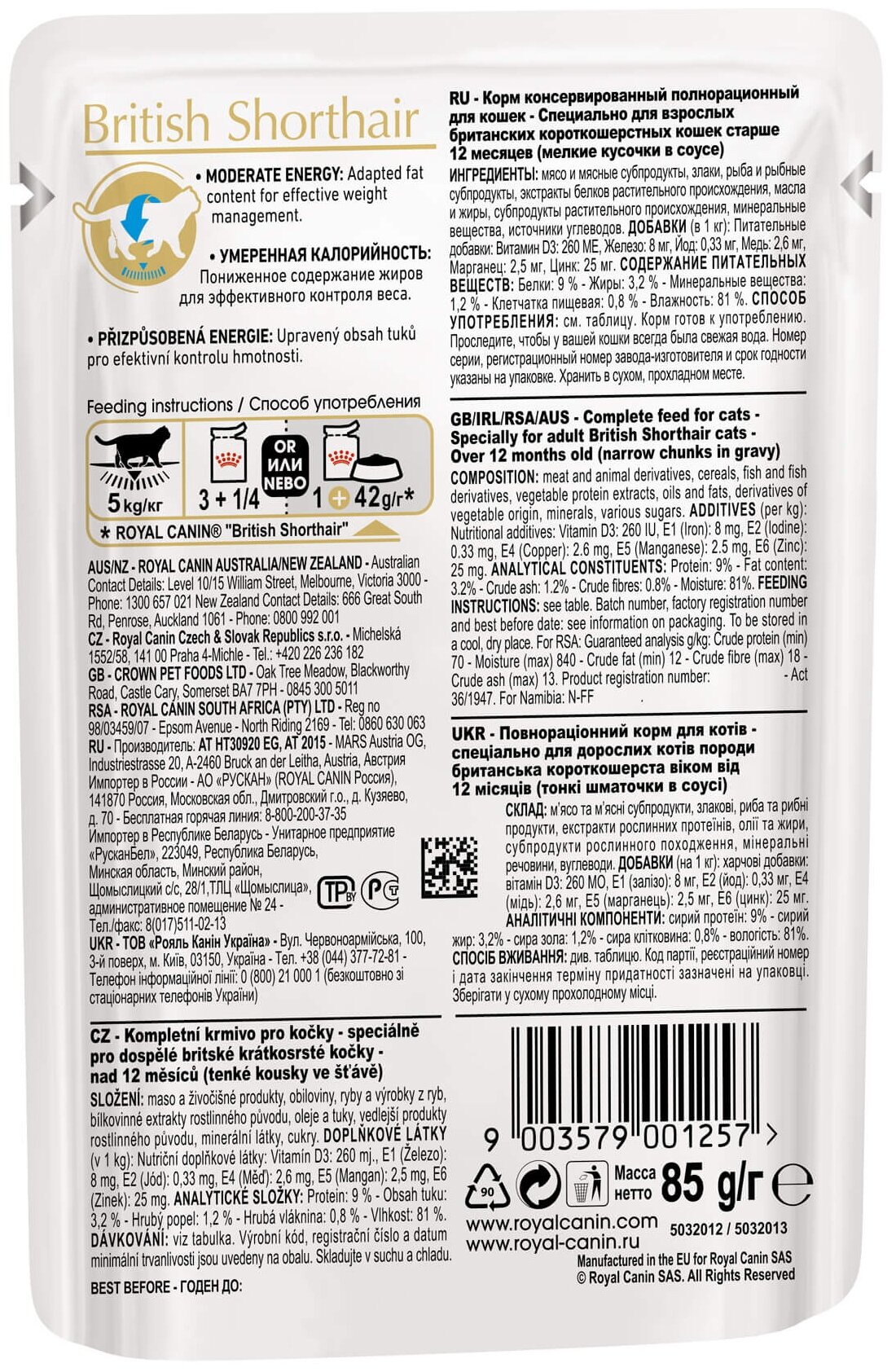 ROYAL CANIN BRITISH SHORTHAIR ADULT для взрослых британских короткошерстных кошек в соусе пауч 85 гр 85 гр х 5 шт