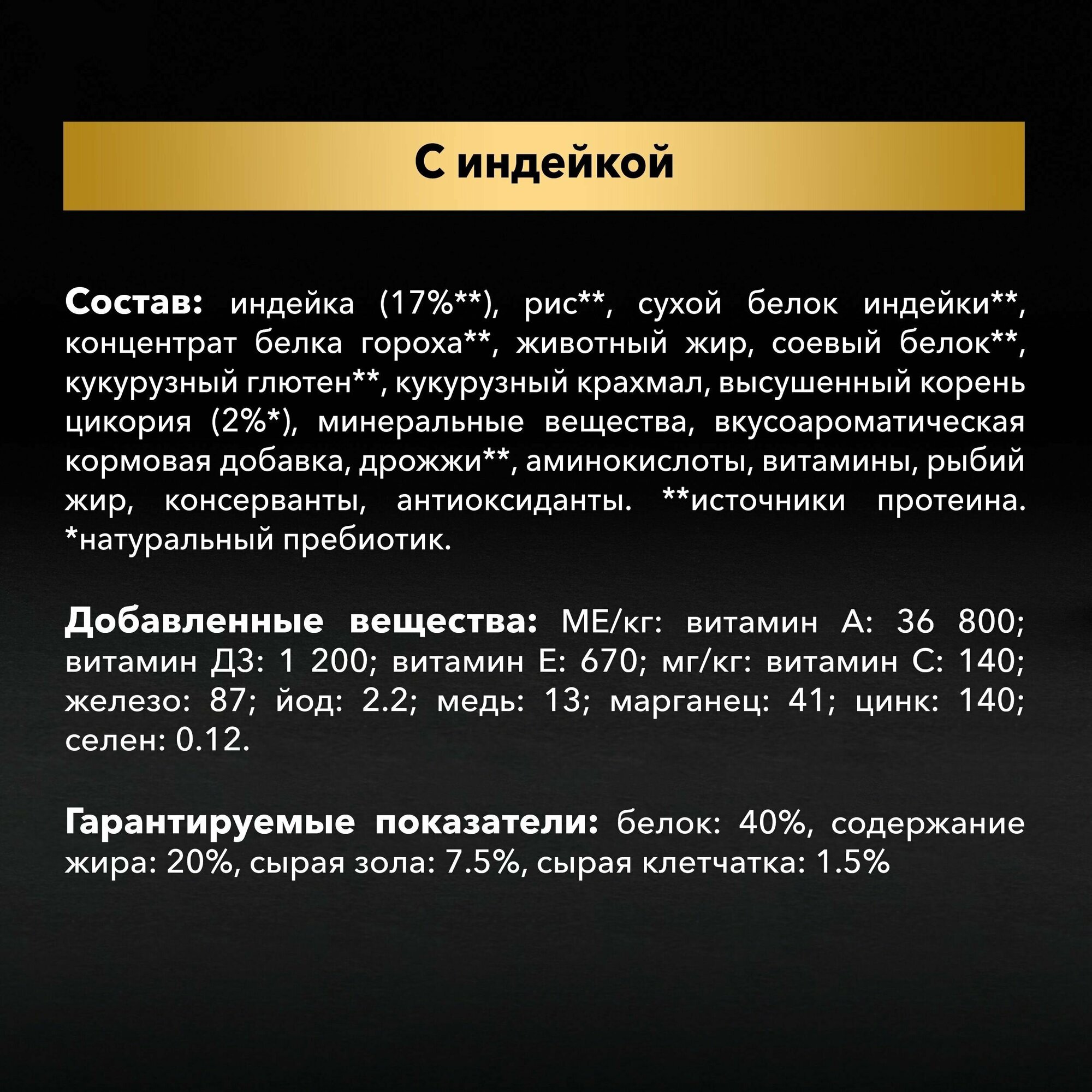 | Состав | курица (20%), сухой белок птицы, рис, пшеничный глютен, животный жир, кукуруза, кукурузный глютен, концентрат белка гороха, кукурузный крахмал, яичный порошок, минеральные вещества, вкусоароматическая кормовая добавка, дрожжи, рыбий жир, консерванты, витамины, аминокислоты, колострум (0.1%) |