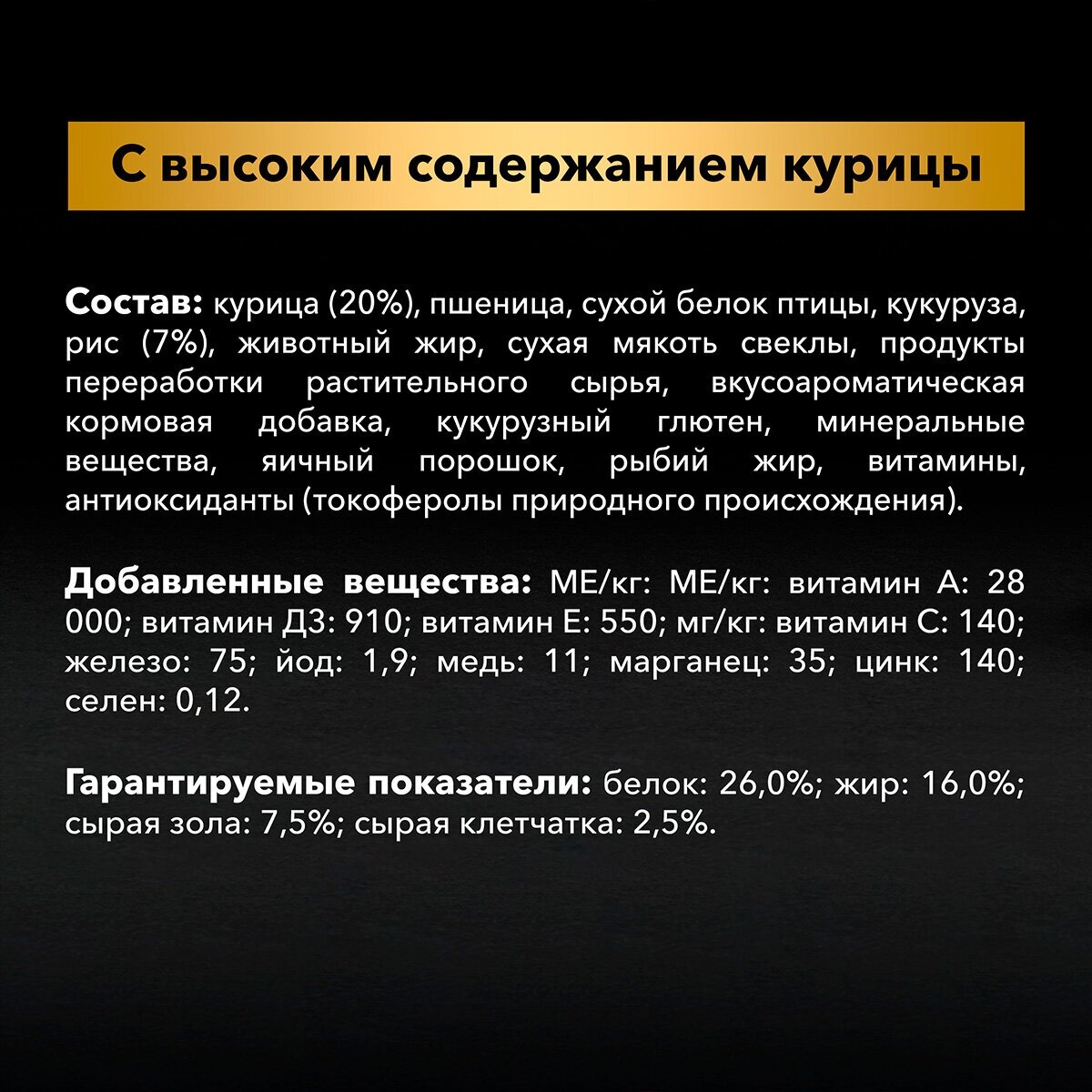 | Состав | обновленный: курица (20%), пшеница, сухой белок птицы, кукуруза, рис (9%), животный жир, сухая мякоть свеклы, вкусоароматическая кормовая добавка, кукурузный глютен, пшеничный глютен,продукты переработки растительного сырья, минеральные вещества, яичный порошок, рыбий жир, витамины, антиоксиданты (токоферолы природного происхождения). прежний: сухой белок птицы, пшеница, кукуруза, курица (14%), животный жир, сухая мякоть свеклы, рис (4%), вкусоароматическая кормовая добавка, глютен, кукурузная мука, продукты переработки растительного сырья, минеральные вещества, рыбий жир, витамины, антиоксиданты |