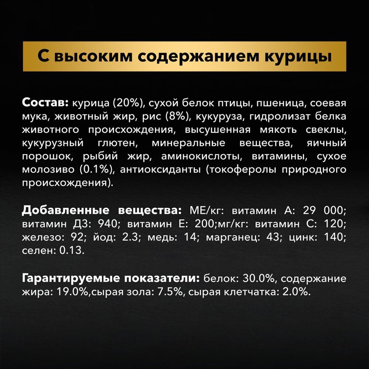 | Состав | курица (18%), пшеница, сухой белок птицы, кукуруза, животный жир, продукты переработки растительного сырья, глютен, рис (4%), вкусоароматическая кормовая добавка, сухая мякоть свеклы, минеральные вещества, рыбий жир, витамины, молозиво, антиоксиданты |