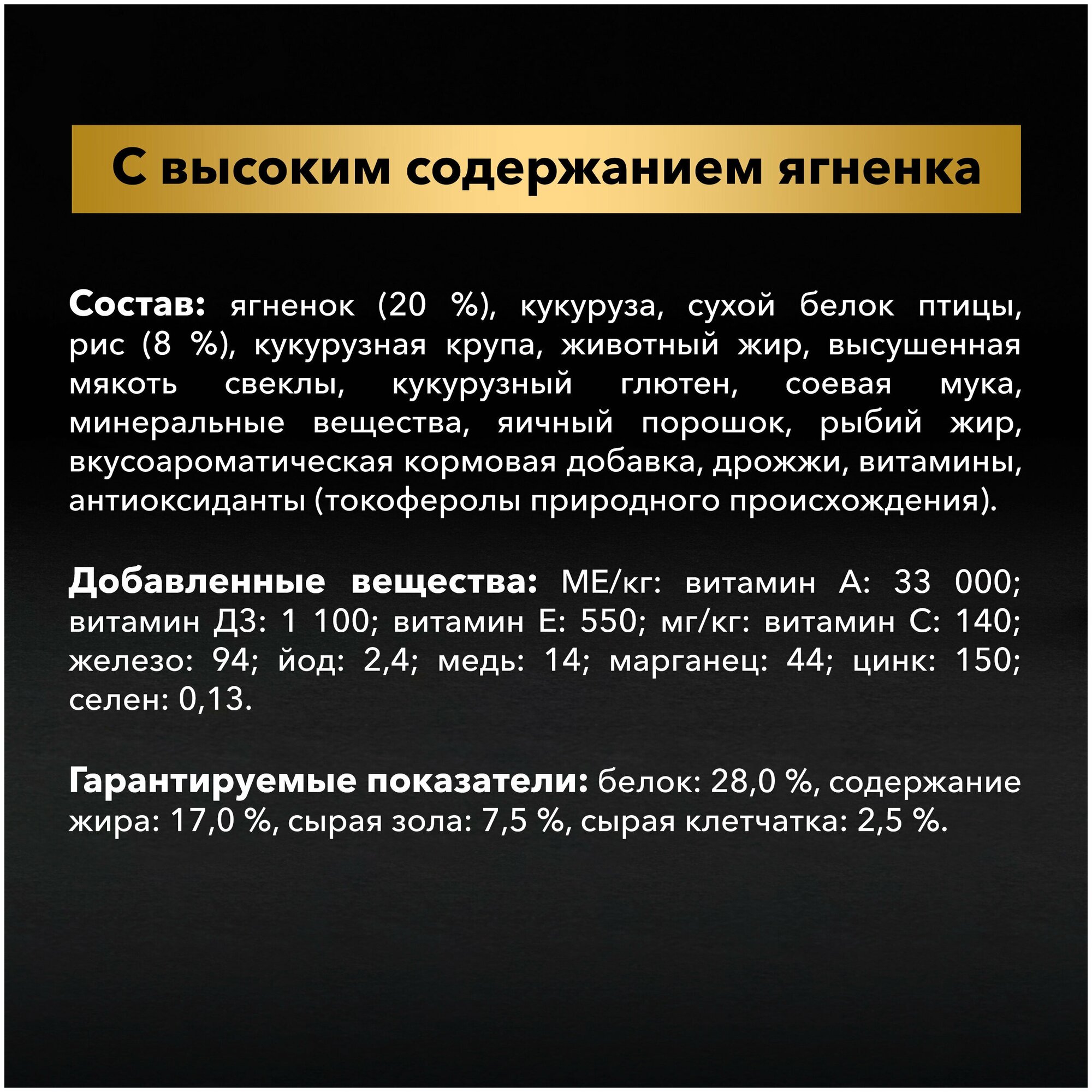 | Состав | ягненок (20%), кукуруза, сухой белок птицы, рис (8%), кукурузная крупа,животный жир, сухая мякоть свеклы, кукурузный глютен, продукты переработки растительного сырья, минеральные вещества, яичный порошок, рыбий жир, вкусоароматическая кормовая добавка, дрожжи, витамины, антиоксиданты (токоферолы природного происхождения) |