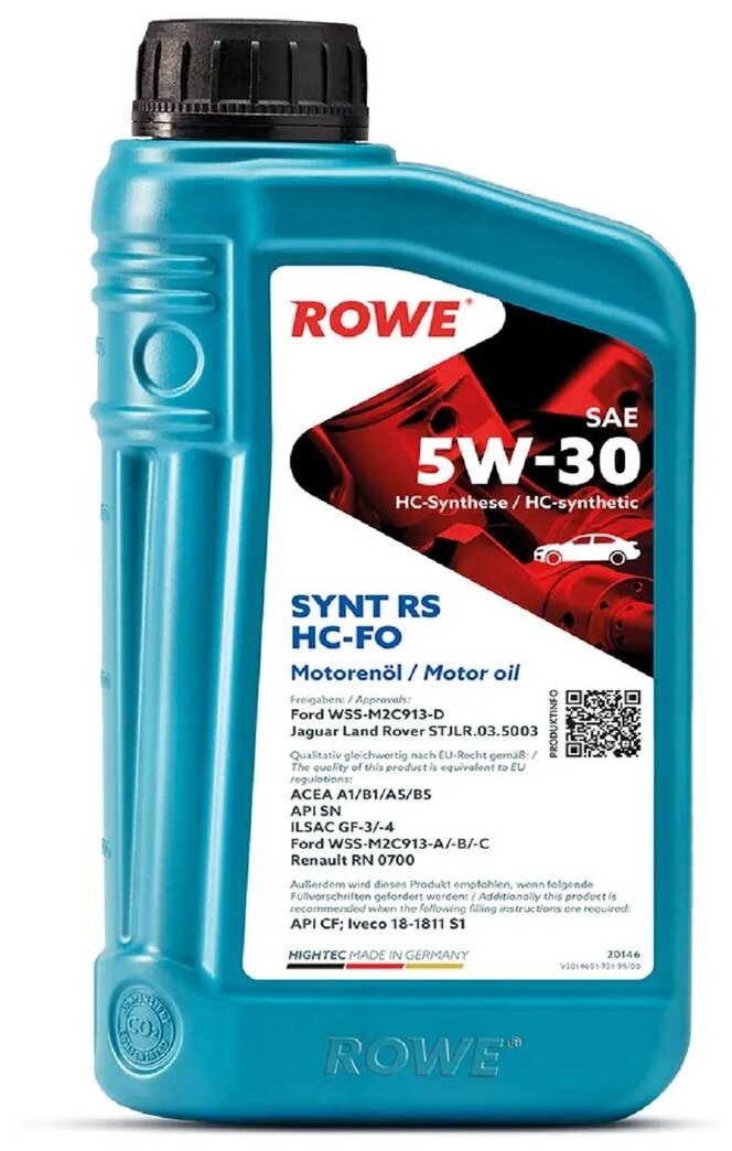 Масло моторное ROWE HIGHTEC SYNT RS SAE 5W-30 HC-FO (20л ) ACEA A1/B1 A5/B5 API SN/CF ILSAC GF-3/-4 Ford WSS-M2C913-A/-B/-C,Renault RN 0700 Iveco 18-1811 S1 Jaguar Land Rover STJLR.03.5003 Ford WSS-M2C913-D 20146020099
