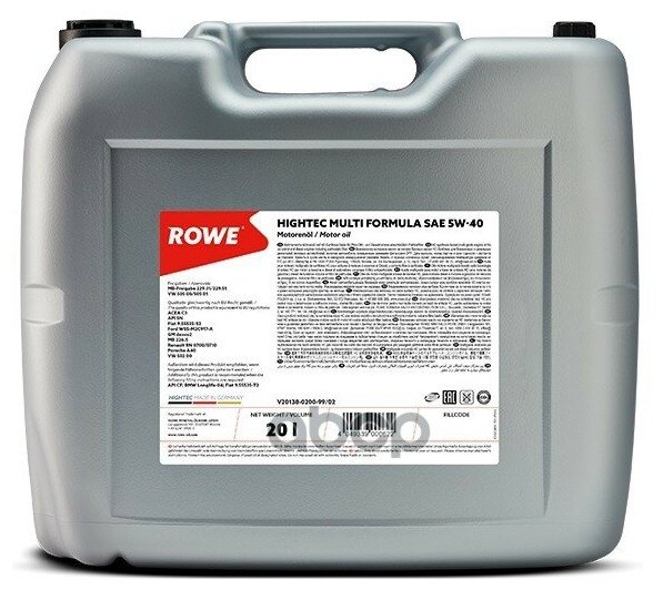ROWE 20138020099 Масло моторное ROWE HIGHTEC MULTI FORMULA 5W-40 C3 (20л) SN,Fiat 9.55535-S2,Ford WSS-M2C917-A,GM dexos2 MB 226.5, Porsche A40, Renault RN 0700/0710API CF, BMW Longlife-04, Fiat 9.55535-T2 MB-Freigabe 229.31/229.51, VW 505 00/505 01
