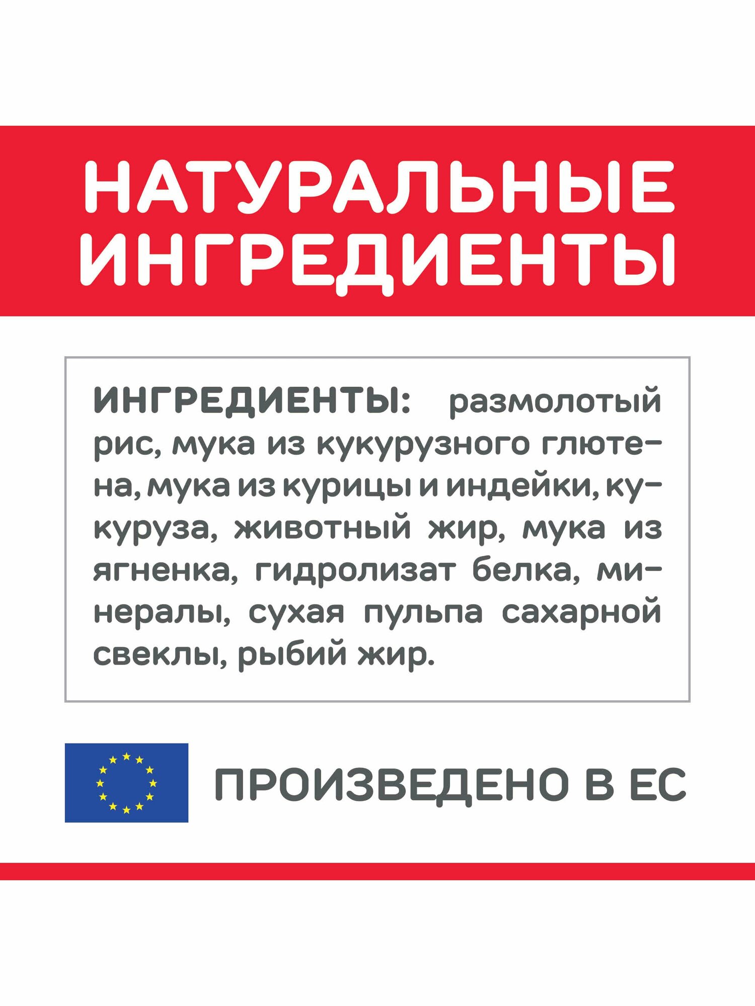 | Состав | размолотый рис, мука из кукурузного глютена, мука из курицы и индейки, кукуруза, животный жир, мука из ягненка, гидролизат белка, минералы, сухая пульпа сахарной свеклы, рыбий жир |