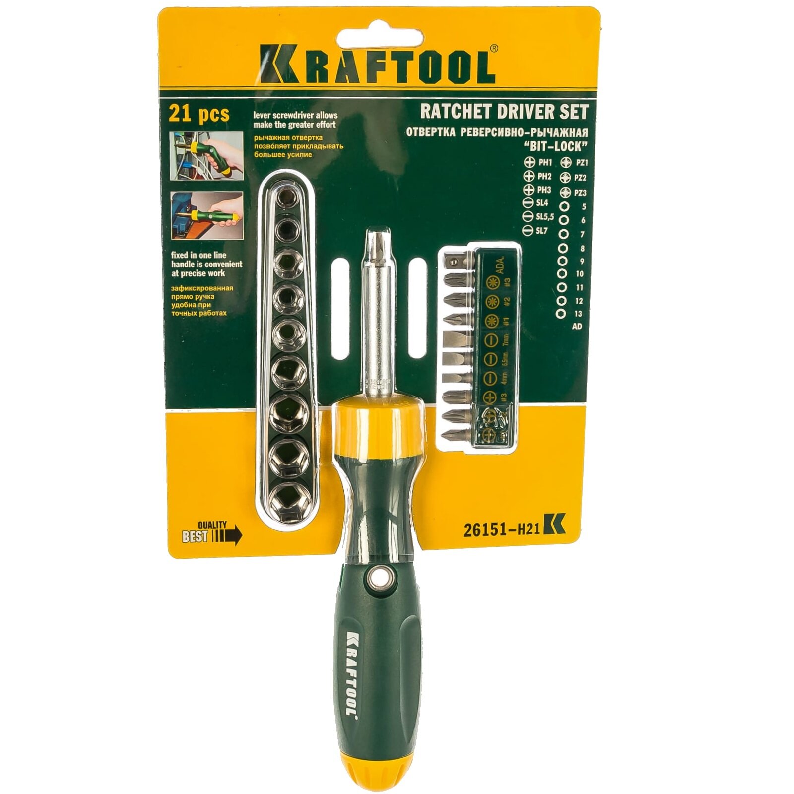 Набор из отвертки "BIT-LOCK" реверсивно-рычажной с битами и торцовыми головками, KRAFTOOL 26151-H21, 21 предмет