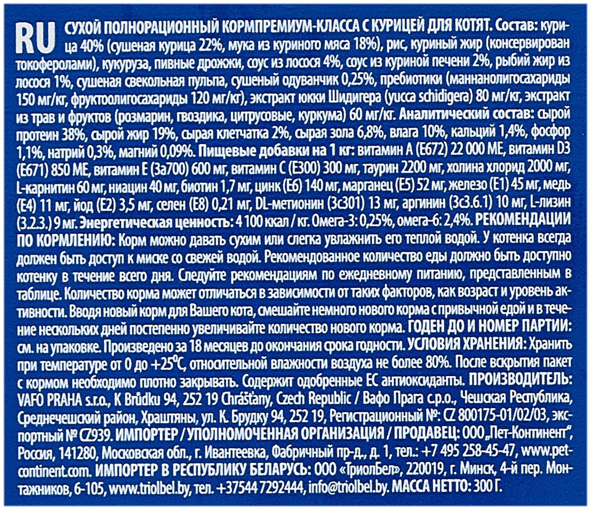 | Состав | курица 40 % (сушеная курица 22 %, мука из куриного мяса 18 %), рис, куриный жир (консервирован токоферолами), кукуруза, пивные дрожжи, соус из лосося 4 %, соус из куриной печени 2 %, рыбий жир из лосося 1 %, сушеная свекольная пульпа, сушеный одуванчик 0,25 %, пребиотики (маннанолигосахариды 150 мг/кг, фруктолигосахариды 120 мг/кг), экстракт юкки (yucca schidigera) (80 мг/кг), экстракт фруктов и трав (розмарин, гвоздика, цитрус, куркума, 60 мг/кг) |