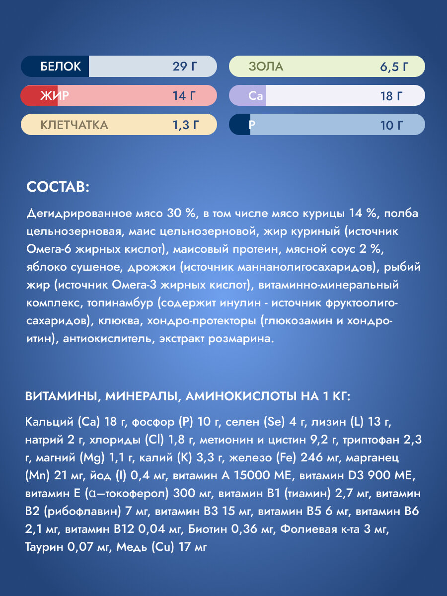 | Состав | мука из мяса курицы (41 %), кукуруза, пшеница, рис, куриный жир (консервированный токоферолами), масло лосося, пивные дрожжи, натуральные ароматизаторы, сушеные яблоки, минеральные вещества, экстракт из трав и фруктов (300 мг/кг), маннан-олигосахариды (150 мг/кг), фруктоолигосахариды (100 мг/кг), экстракт юкки шидигеры (80 мг/кг), органическая Е4 медь, органический Е6 цинк, органический селен |