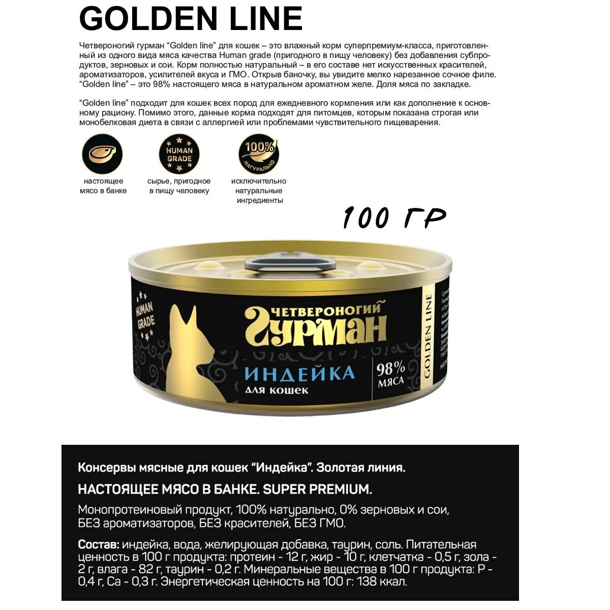 Четвероногий Гурман Золотая линия влажный корм для взрослых кошек, индейка натуральная в желе 100 гр (10 шт)