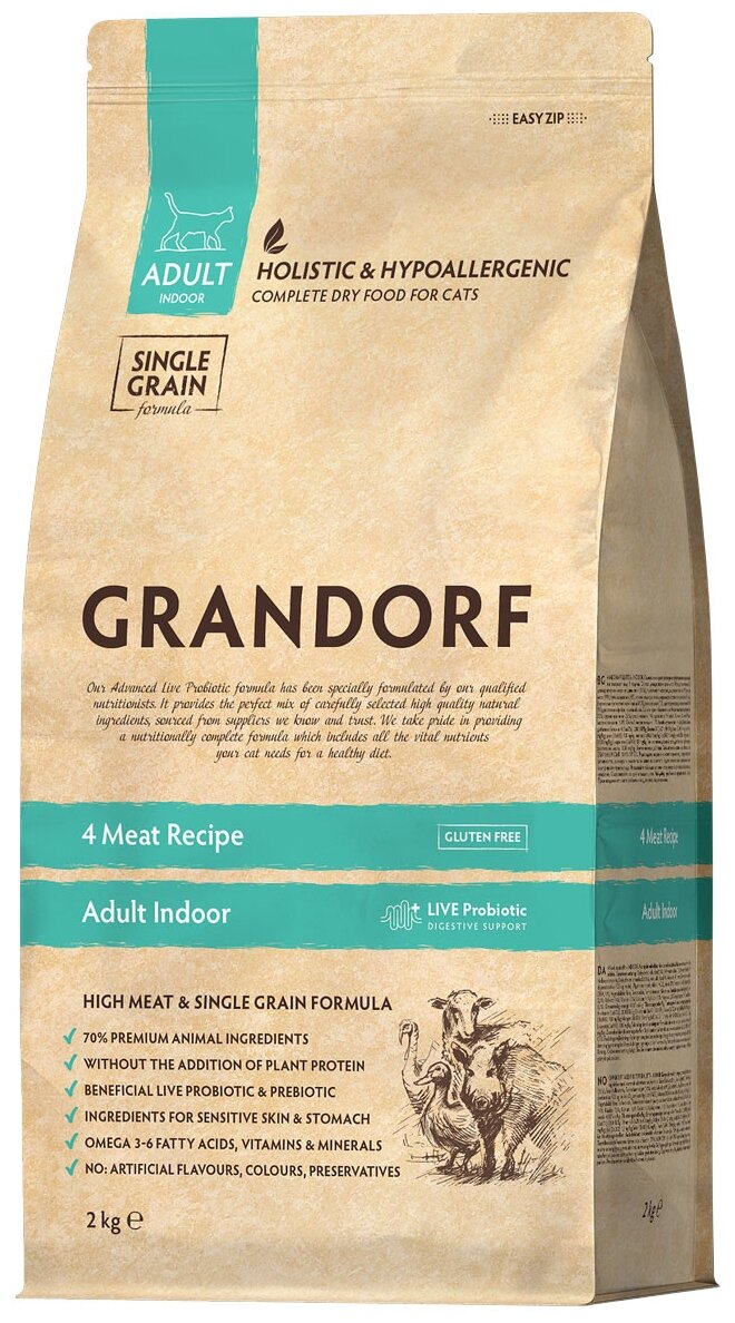 Корм для кошек GRANDORF 4 Мяса Indoor 2кг. Для взрослых кошек от 1 года с нормальной активностью. С пробиотиками