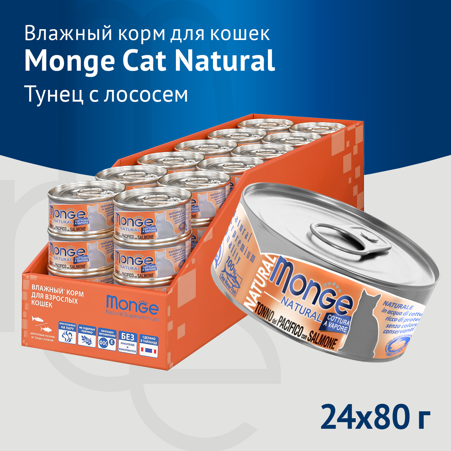 Влажный корм для кошек Monge Natural, с тихоокеанским тунцом, с лососем 24 шт. х 80 г