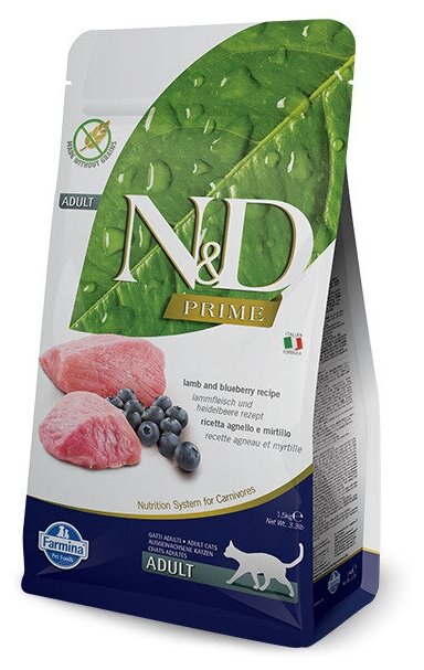 Корм для кошек сухой N&D Prime / Фармина Cat Lamb & Blueberry Adult беззерновой для взрослых животных всех пород, гранулы с ягненком и черникой 1.5кг