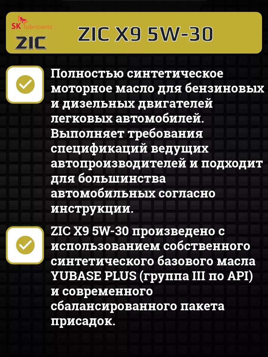 Масло моторное синтетическое X9 5W30 API SL/CF/SN, ACEA A3/B3/B4 (4л) ZIC 162614