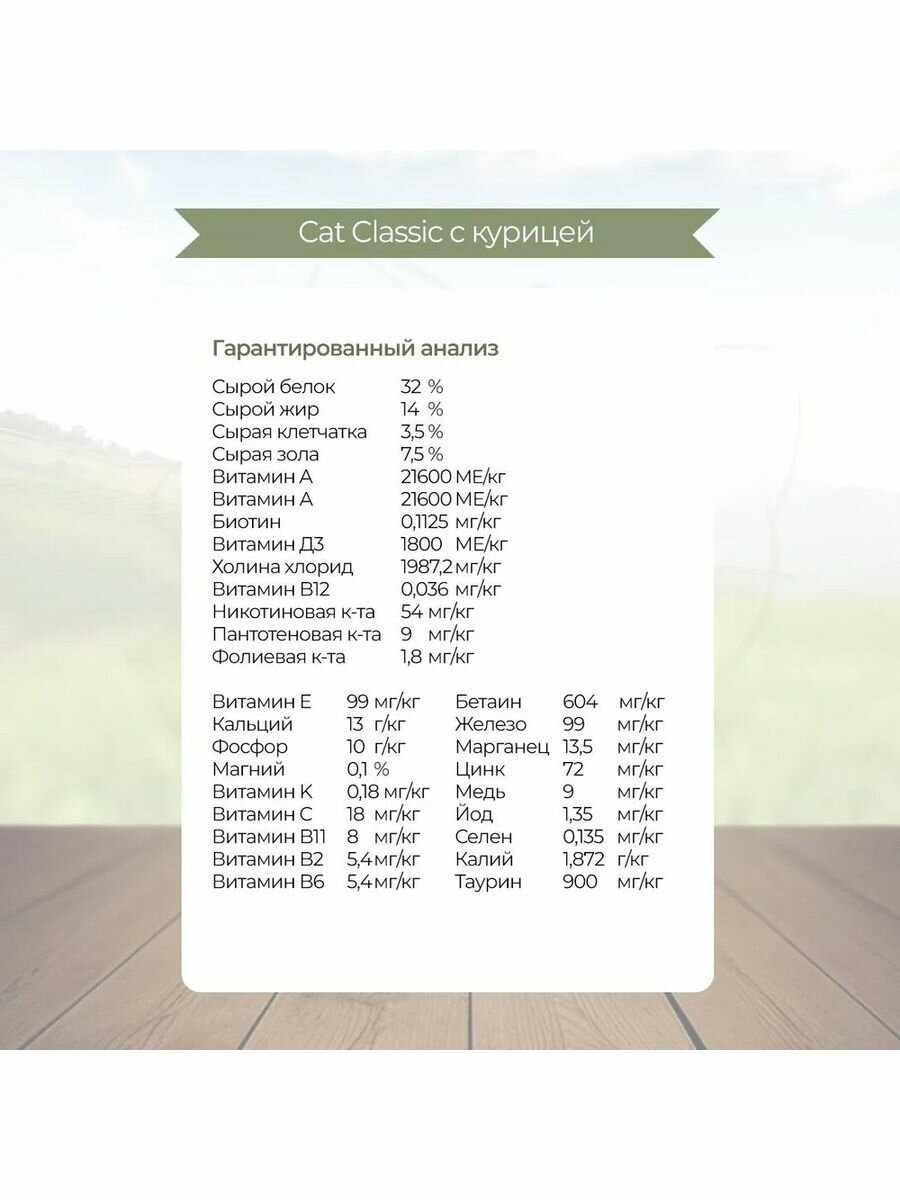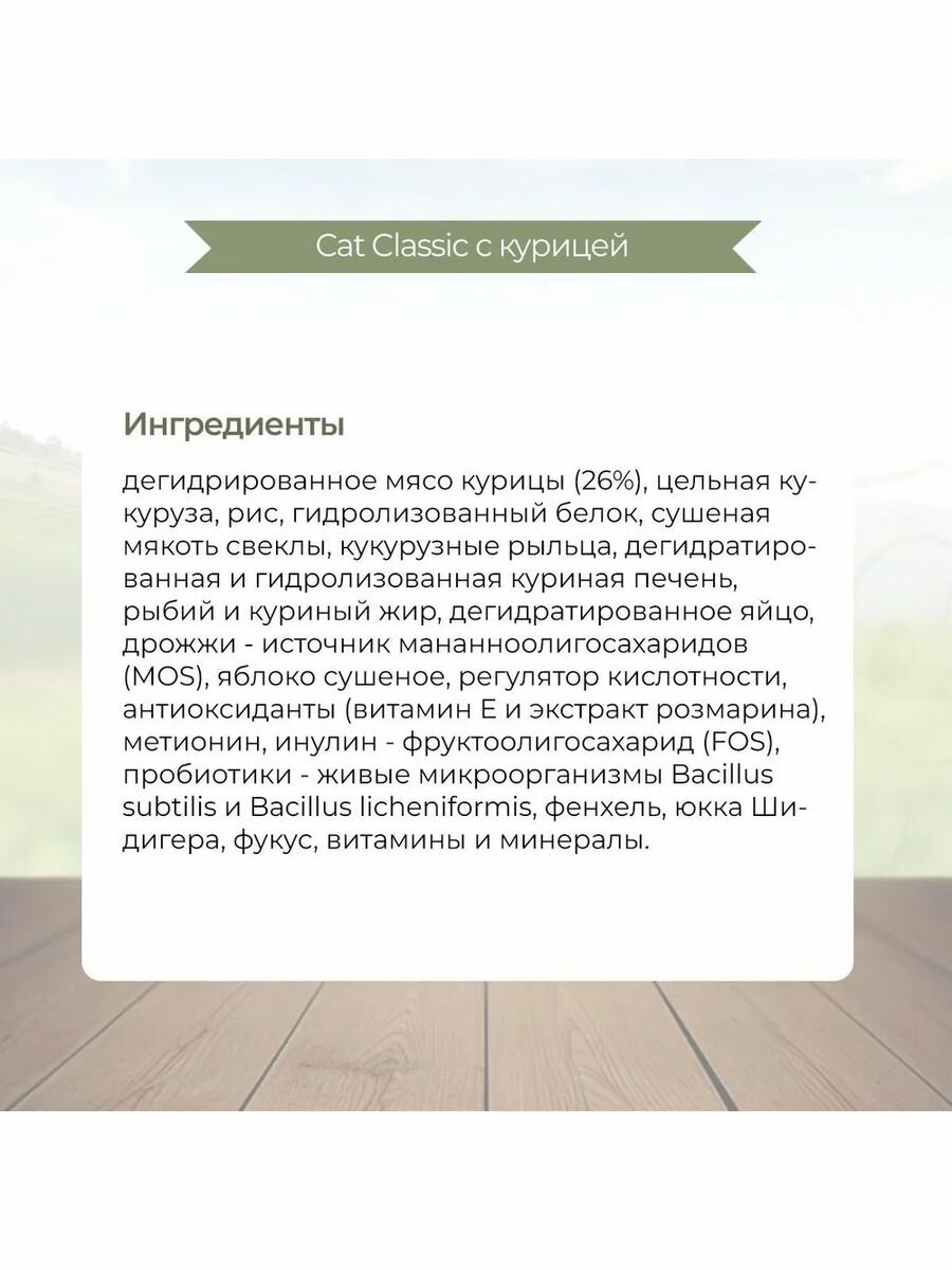 | Состав | дегидрированное мясо курицы (26%), цельная кукуруза, рис, гидролизованный белок, сушёная мякоть свеклы, кукурузные рыльца, дегидратированная и гидролизованная куриная печень, рыбий и куриный жир, дегидратированное яйцо, дрожжи — источник мананноолигосахаридов (MOS), яблоко сушёное, регулятор кислотности, антиоксиданты (витамин Е и экстракт розмарина), метионин, инулин — фруктоолигосахарид (FOS), пробиотики — живые микроорганизмы Bacillus subtilis и Bacillus licheniformis, фенхель, юкка Шидигера, фукус, витамины и минералы |