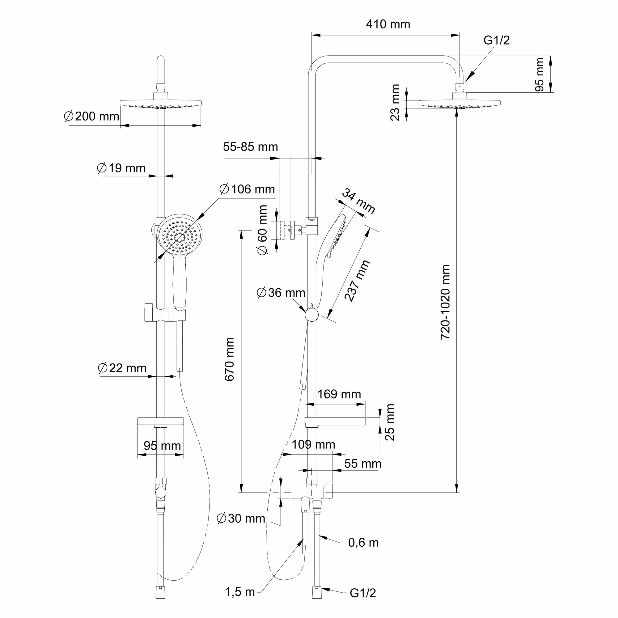 | Дополнительная информация | диаметр верхнего душа: 200 мм; регулировка штанги по высоте 970-675 мм |