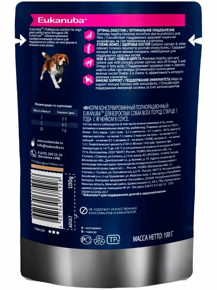 Eukanuba ADULT ALL BREED LAMB пауч влажный корм для взрослых собак всех пород, ягнёнок в соусе, 100 гр