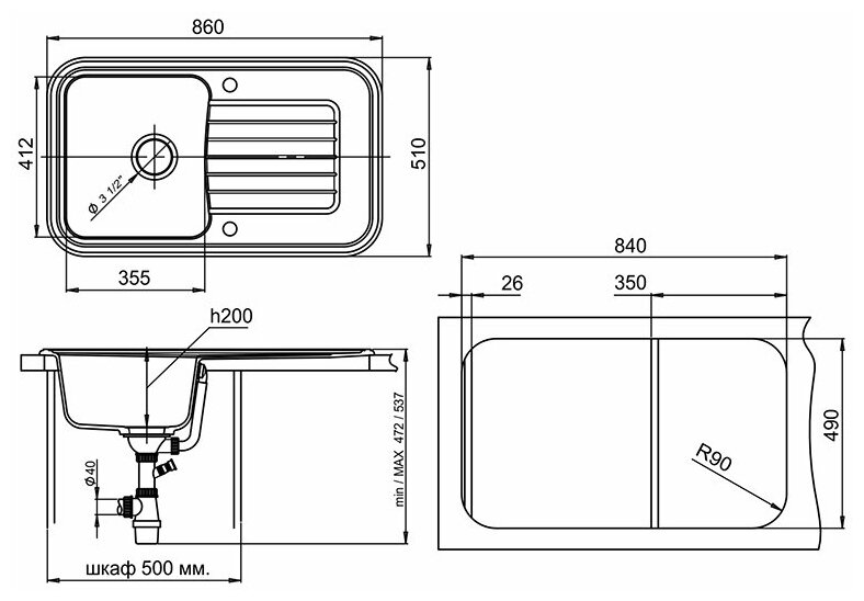 Мойка EWIGSTEIN Antik 60F 1 чаша+крыло 860*510мм (антрацит)